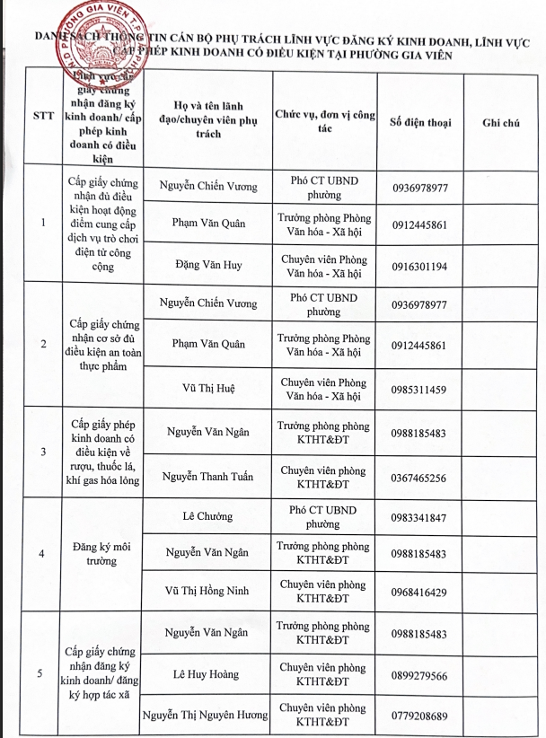 Danh sách thông tin cán bộ phụ trách lĩnh vực Đăng ký kinh doanh, lĩnh vực Cấp phép kinh doanh có điều kiện tại phường Gia Viên
