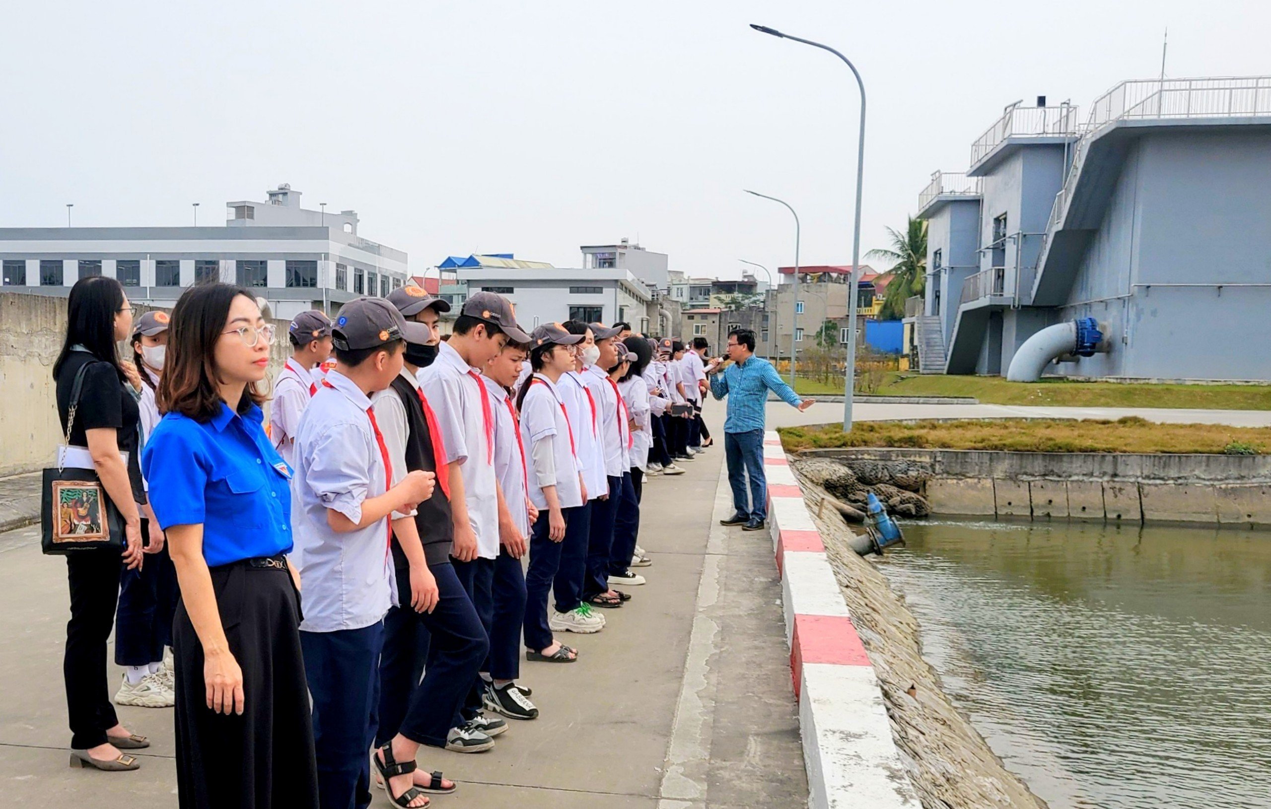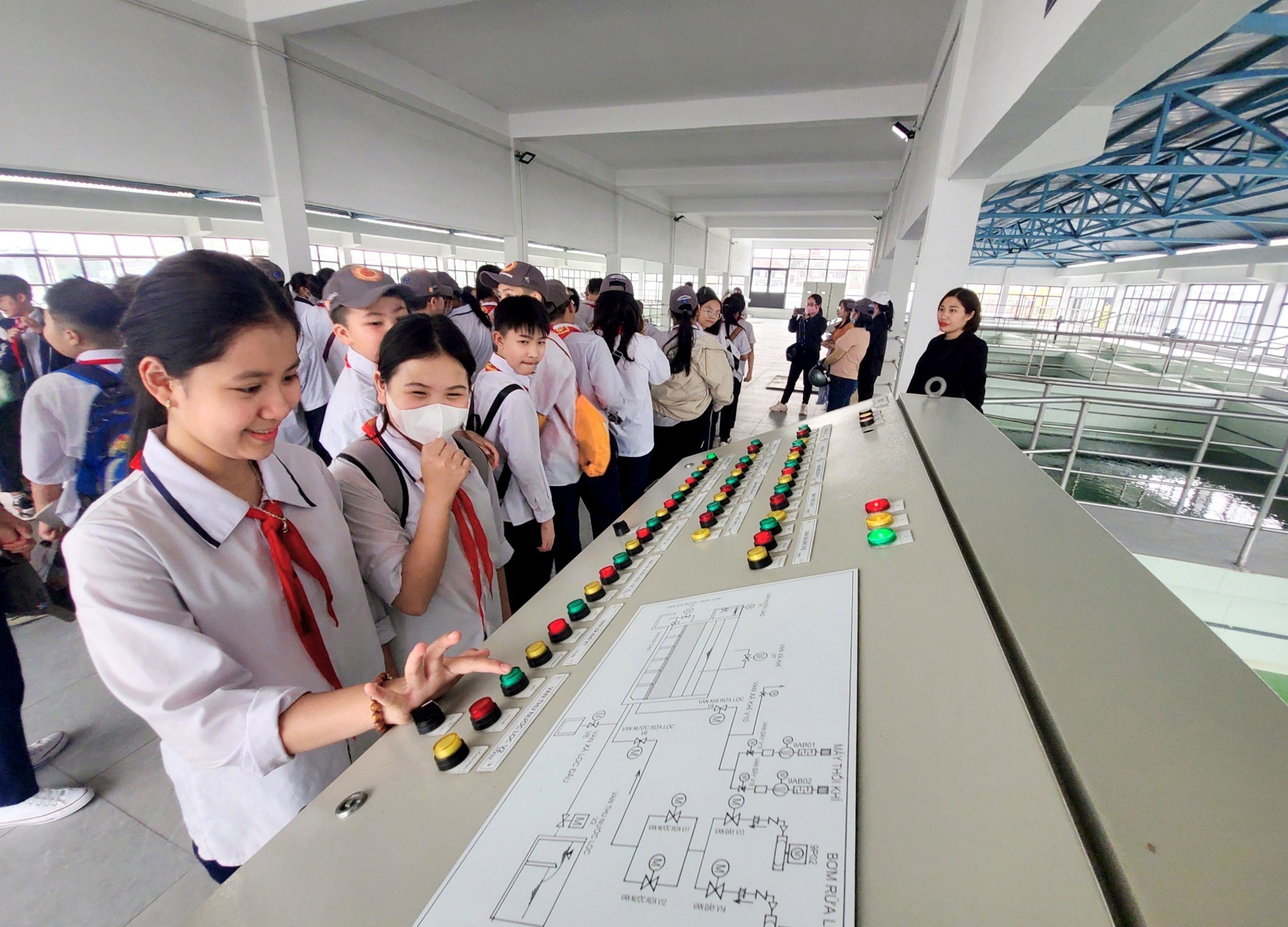 Các em học sinh Trường THCS Lý Tự Trọng tìm hiểu thực tế về quy trình cấp nước sinh hoạt hàng ngày.