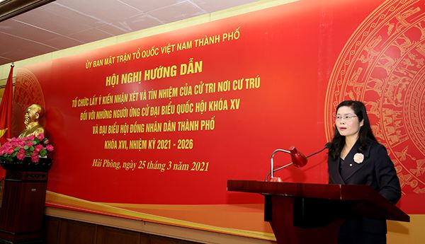 (Haiphong.gov.vn) – Sáng 25/3, tại Trung tâm Hội nghị thành phố, Ủy ban Mặt trận Tổ quốc Việt Nam (MTTQVN) thành phố tổ chức Hội nghị hướng dẫn tổ chức lấy ý kiến nhận xét, tín nhiệm của cử tri nơi cư trú đối với người ứng cử đại biểu Quốc hội khóa XV và đại biểu HĐND thành phố khóa XIV, nhiệm kỳ 2021 – 2026. Đồng chí Vũ Anh Thư, Phó Chủ tịch Ủy ban MTTQ Việt Nam thành phố chủ trì hội nghị. Tham dự có các cơ quan, tổ chức, đơn vị có người được giới thiệu ứng cử và đại diện Ban Thường trực Ủy ban MTTQ Việt Nam các quận, huyện, xã phường, thị trấn có người ứng cử cư trú.