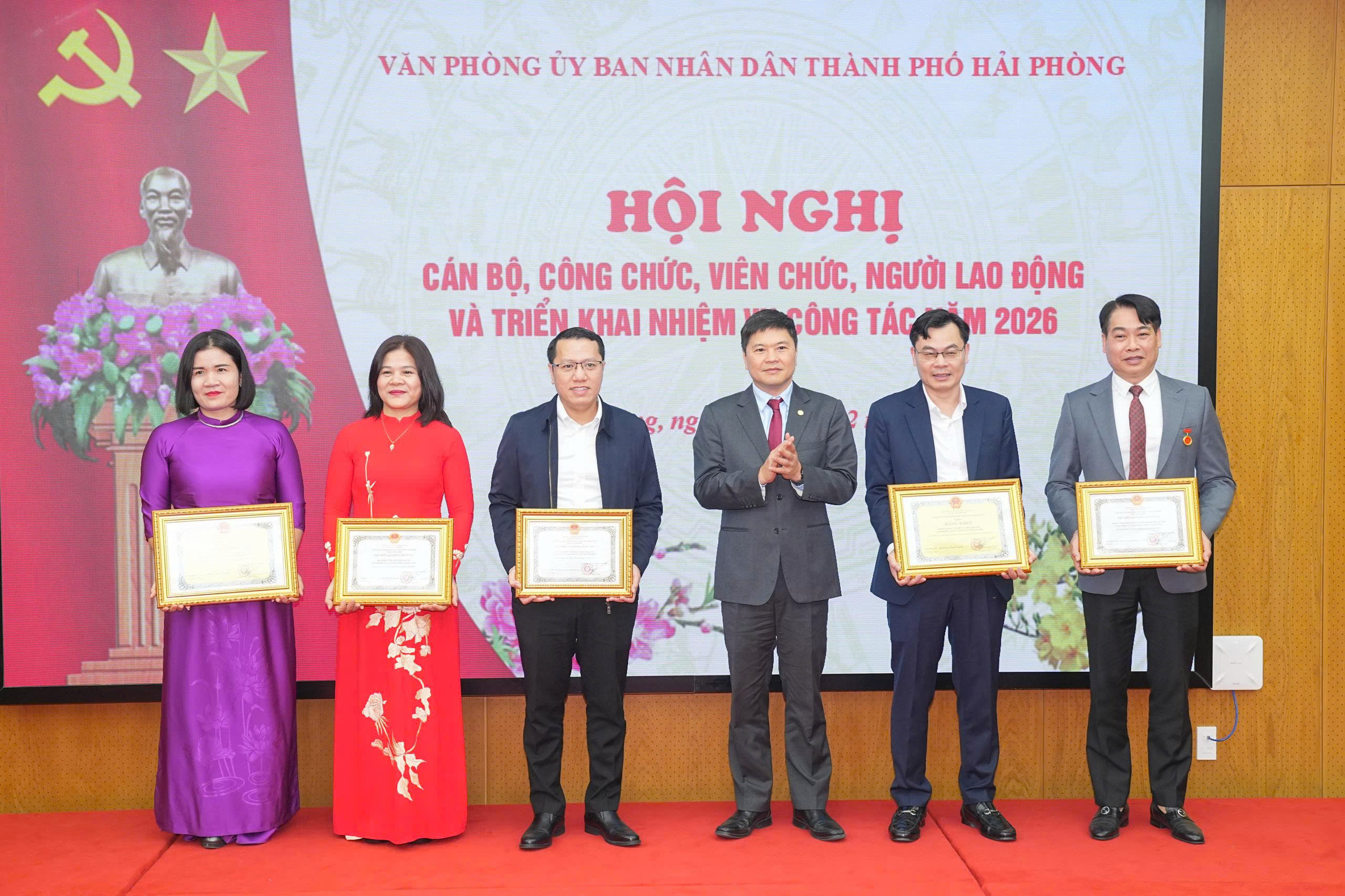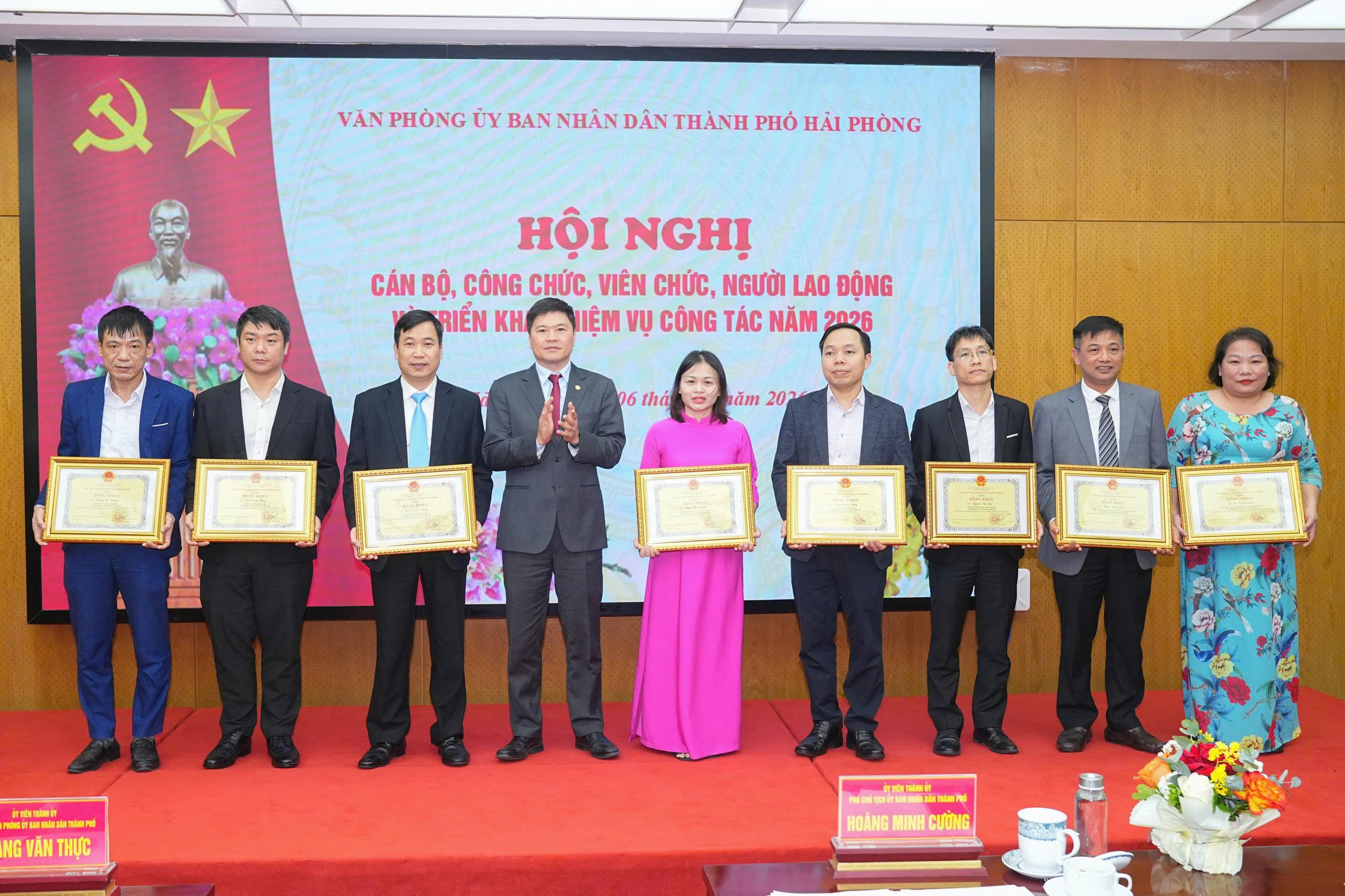 Phó Chủ tịch UBND thành phố Hoàng Minh Cường trao bằng khen của Chủ tịch UBND thành phố cho các cá nhân có thành tích xuất sắc.Trong công tác chuyên môn, Văn phòng đã tham mưu giúp UBND thành phố triển khai thực hiện hiệu quả các Nghị quyết, Chương trình, Kế hoạch phát triển kinh tế - xã hội, quốc phòng - an ninh. Năm 2025, thành phố có 18/22 chỉ tiêu kinh tế - xã hội hoàn thành và vượt kế hoạch; GRDP ước tăng 11,81%, đứng thứ hai toàn quốc và cao nhất trong 6 thành phố trực thuộc Trung ương; thu ngân sách nhà nước ước đạt hơn 187.766 tỷ đồng, đạt 127,4% dự toán Trung ương giao.