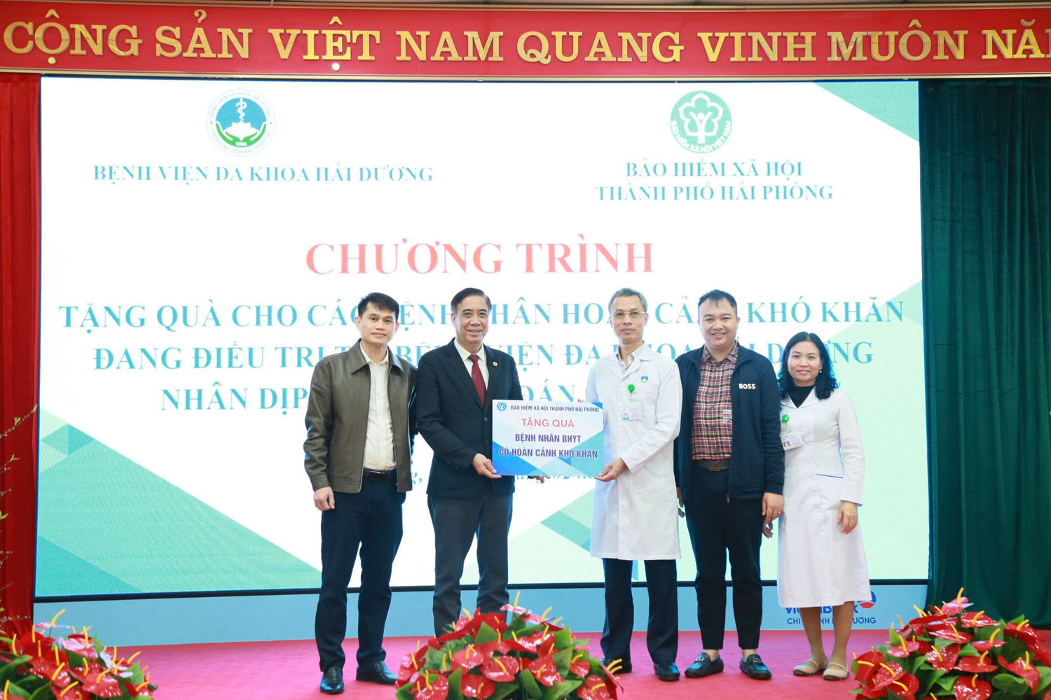 Lãnh đạo BHXH thành phố Hải Phòng trao biển tượng trưng quà cho các gia đình bệnh nhân thông qua các cơ sở y tế.Tại mỗi bệnh viện, lãnh đạo BHXH thành phố đã trao tặng quà cho 10 bệnh nhân, đồng thời thăm hỏi tình hình sức khỏe, hoàn cảnh gia đình của từng bệnh nhân, chia sẻ, động viên người bệnh và thân nhân yên tâm điều trị, vượt qua khó khăn, tin tưởng vào chính sách BHYT, sự đồng hành của các cơ sở y tế trong quá trình khám, chữa bệnh và đón Tết an lành.