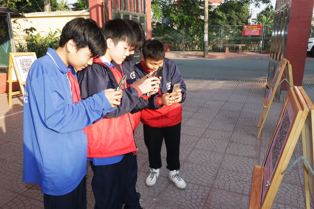 Các em học sinh trải nghiệm quét mã QR số hóa phòng chống tệ nạn xã hội.