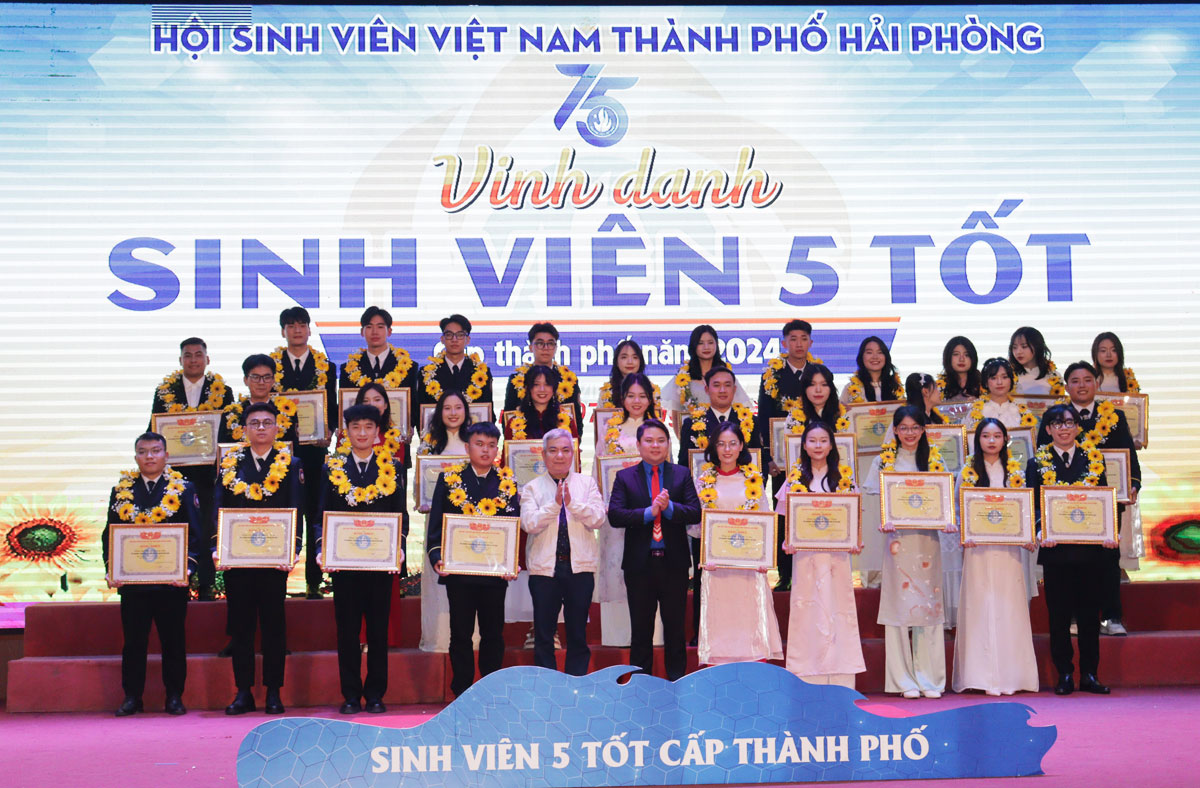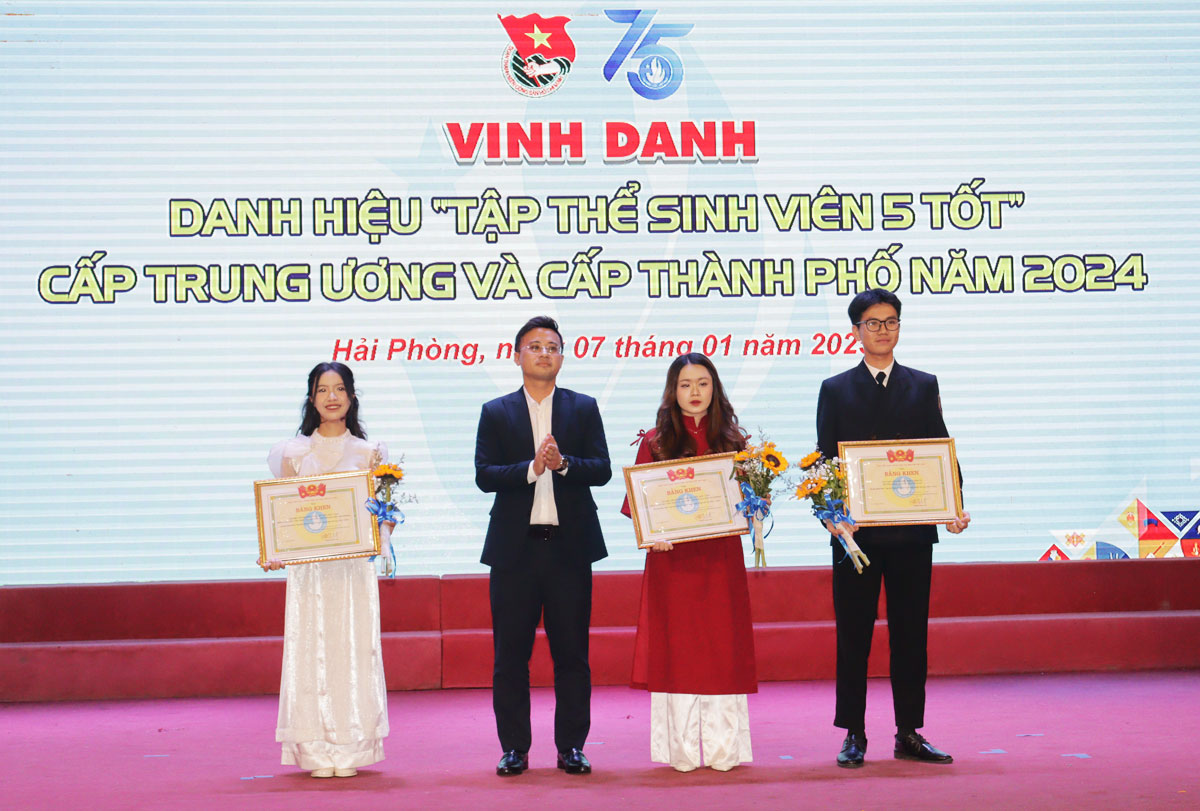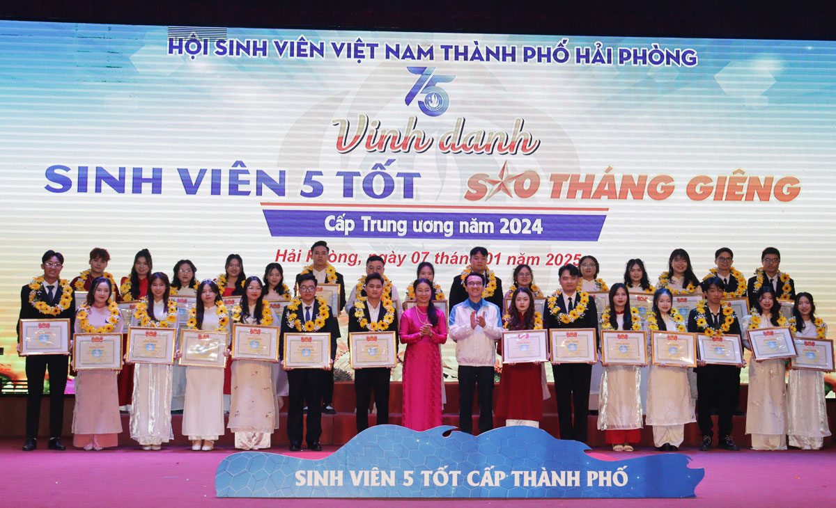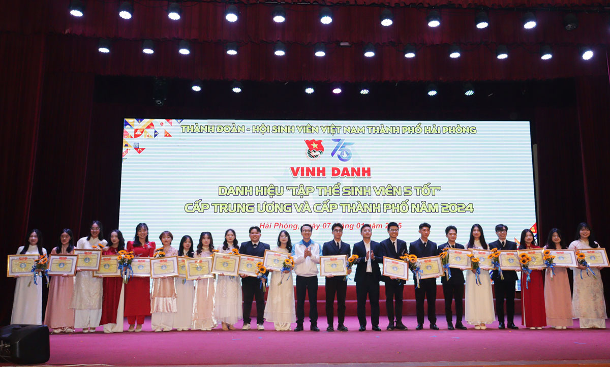 (Haiphong.gov.vn) - Tối 7/1, Thành đoàn - Hội Sinh viên Việt Nam thành phố tổ chức chương trình Kỷ niệm 75 năm Ngày truyền thống học sinh, sinh viên và Hội Sinh viên Việt Nam (09/01/1950 - 09/01/2025); Biểu dương “Sinh viên 5 tốt” và “Tập thể Sinh viên 5 tốt” cấp thành phố năm 2024.