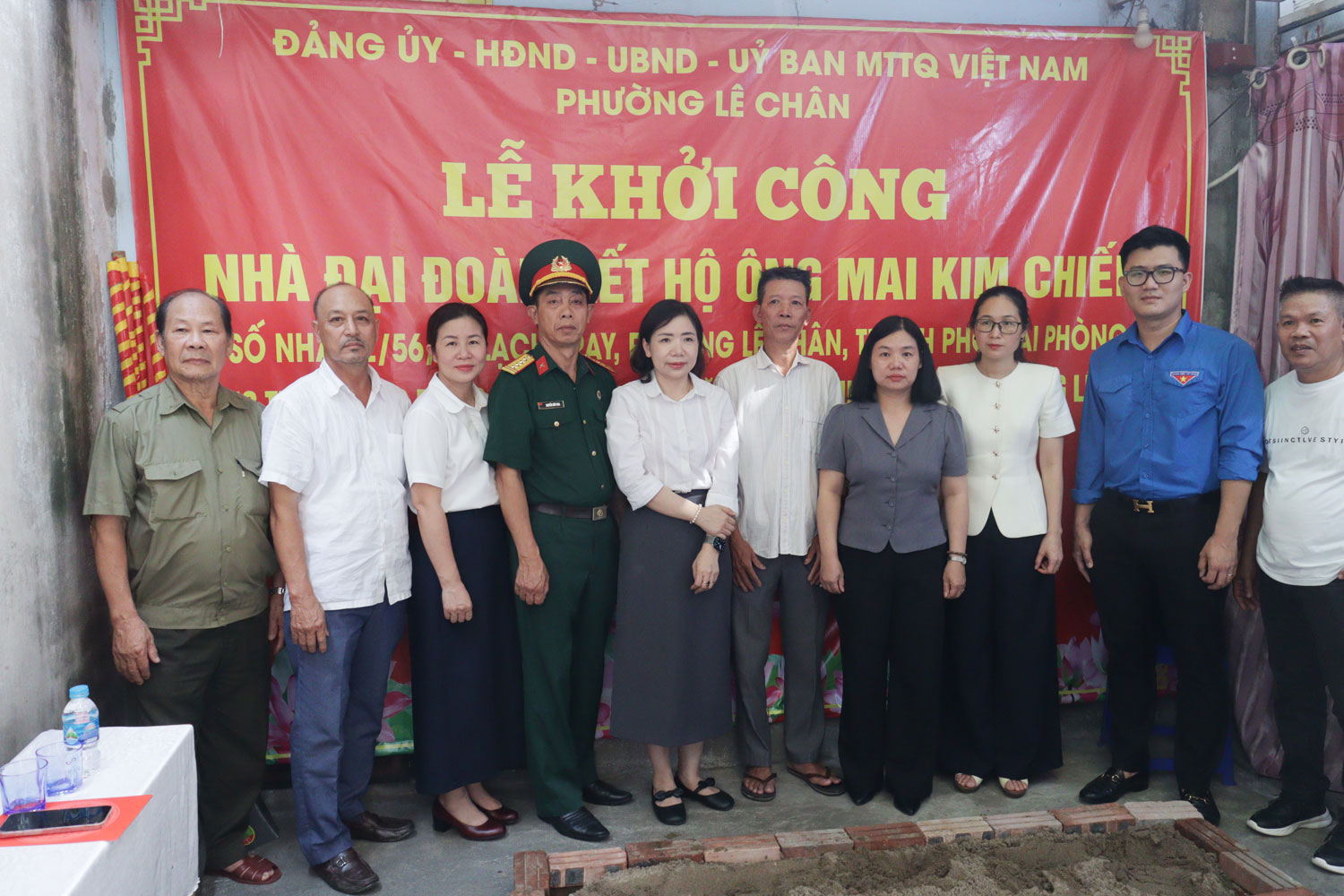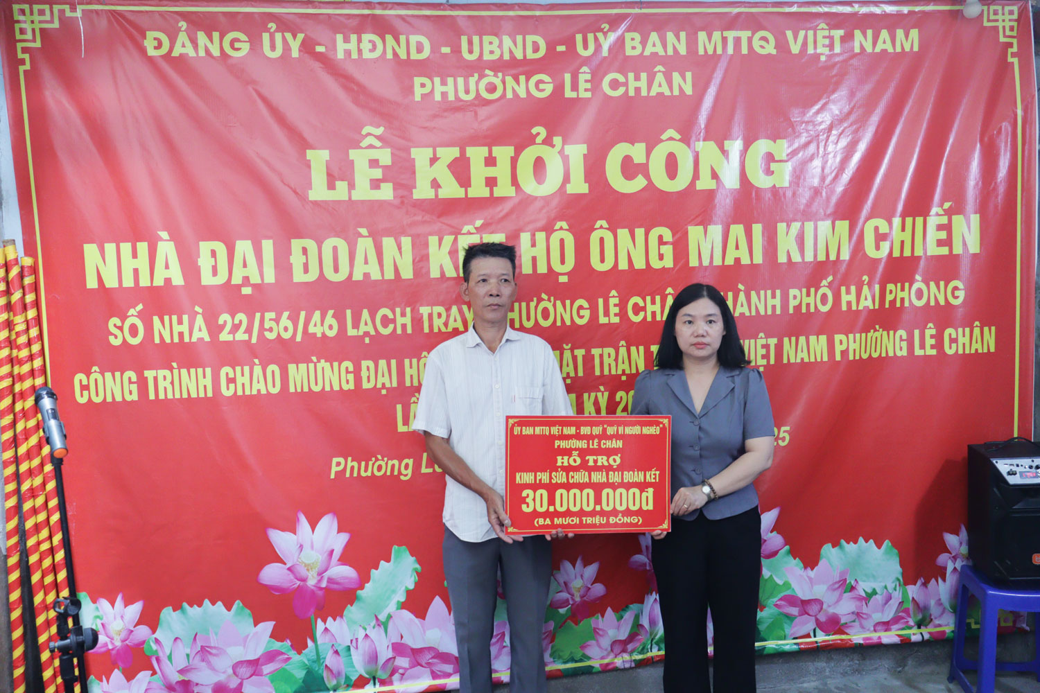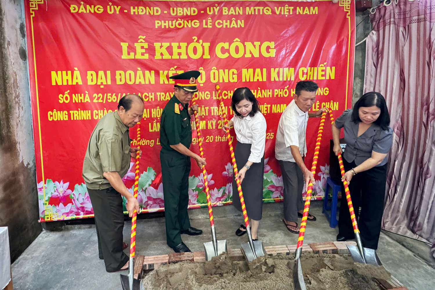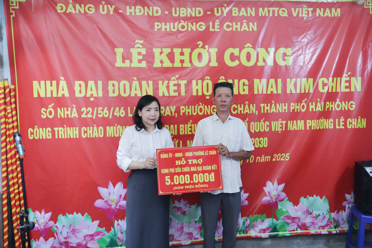 (Haiphong.gov.vn) - Chào mừng Đại hội đại biểu MTTQ Việt Nam phường Lê Chân lần thứ I, nhiệm kỳ 2025 - 2030; kỷ niệm 95 năm ngày truyền thống MTTQ Việt Nam (18/11/1930 - 18/11/2025), chiều 20/10, Ủy ban MTTQ Việt Nam phường Lê Chân tổ chức Lễ khởi công sửa Nhà “Đại đoàn kết” cho hộ gia đình có hoàn cảnh khó khăn trên địa bàn phường. Tới dự có đồng chí Nguyễn Thị Minh Ngọc, Phó Bí thư Thường trực Đảng ủy phường.