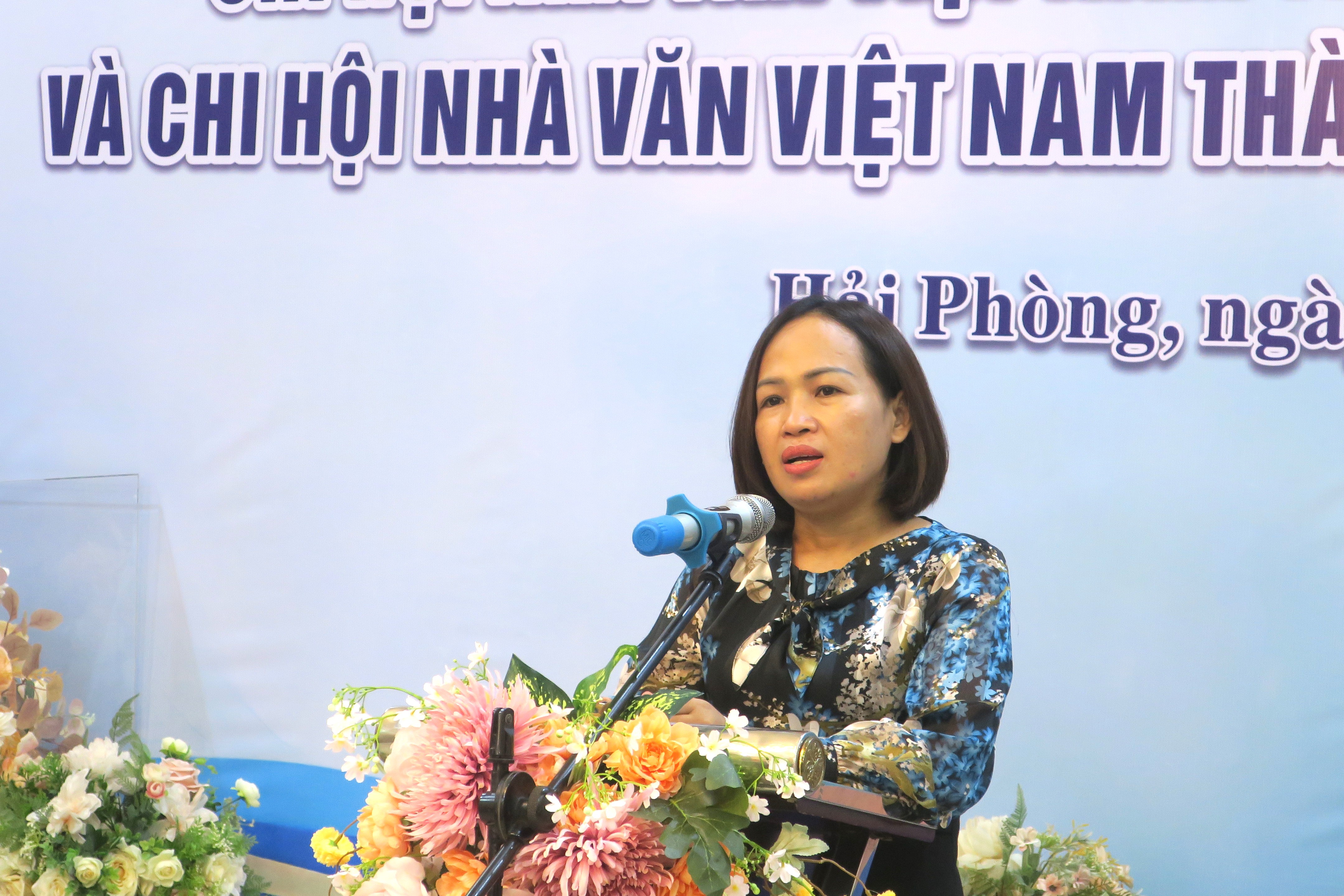 Nhà văn Đặng Thị Thúy, Phó Chủ tịch Hội Liên hiệp Văn học Nghệ thuật thành phố phát biểu.Phát biểu tại Hội nghị, Nhà văn Đặng Thị Thúy, Phó Chủ tịch Hội Liên hiệp Văn học Nghệ thuật thành phố chúc mừng Chi Hội Nhà văn Việt Nam thành phố Hải Phòng được kiện toàn. Phó Chủ tịch Hội Liên hiệp Văn học nghệ thuật thành phố mong muốn với 42 hội viên là các nhà văn, nhà thơ kỳ cựu của thành phố, các hoạt động của Chi hội sẽ hoàn thành theo kế hoạch và có nhiều khởi sắc, góp phần làm phong phú nền văn học thành phố cũng như của nước nhà.