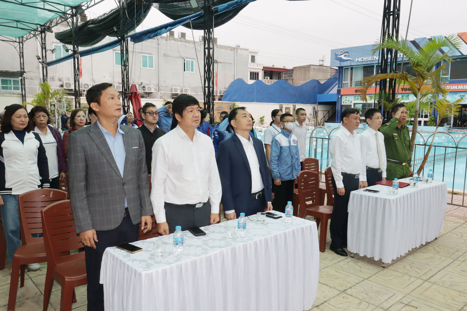 Các đại biểu làm Lễ chào cờ.Tham gia giải bơi trong bể, Ban Tổ chức đã nhận được danh sách đăng ký của 100% các trường THCS trên địa bàn với gần 40 vận động viên tham gia. Thông qua giải bơi tiếp tục tuyên truyền về lợi ích, tác dụng của việc tập luyện môn bơi, các kỹ năng an toàn trong môi trường nước và vận động toàn dân tích cực tập luyện môn bơi để nâng cao sức khỏe, tầm vóc, thể lực, phòng, chống bệnh tật cho trẻ em và cộng đồng. Đây là dịp để tuyển chọn vận động viên tham gia thi đấu Đại hội Thể dục, thể thao thành phố lần thứ X.
