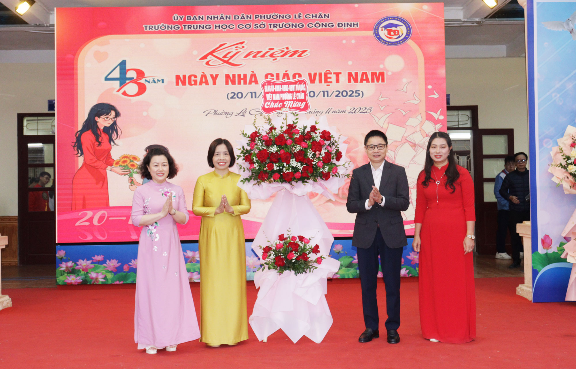 Lãnh đạo phường Lê Chân tặng hoa chúc mừng Trường THCS Trương Công Định.