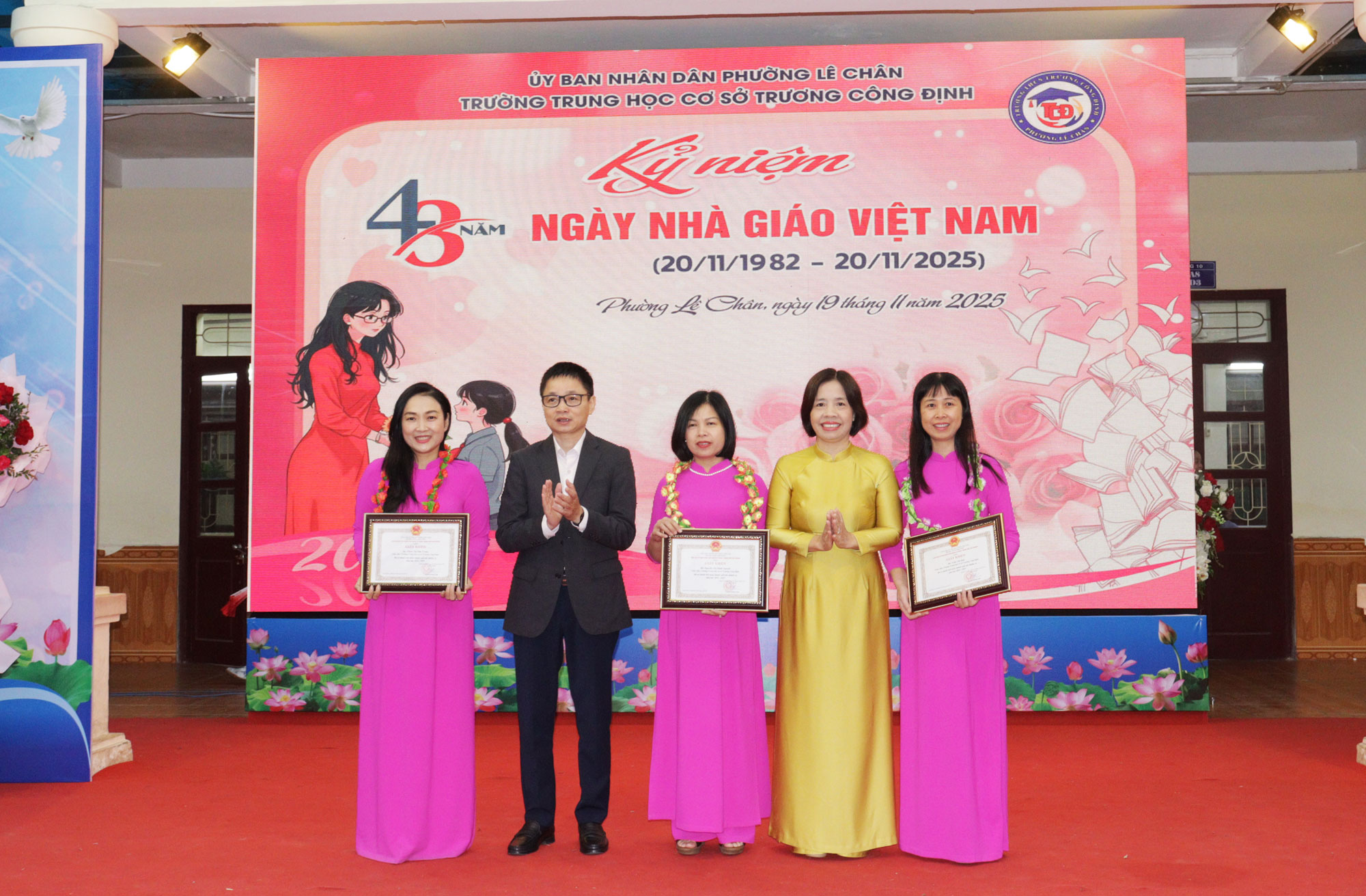 (Haiphong.gov.vn) - Chiều 19/11, THCS Trương Công Định (phường Lê Chân) tổ chức kỷ niệm 43 năm Ngày Nhà giáo Việt Nam (20/11/1982 - 20/11/2025) và biểu dương giáo viên đạt thành tích cao năm học 2024 - 2025. Tới dự có đồng chí Phạm Việt Anh, Phó Chủ tịch UBND phường.
