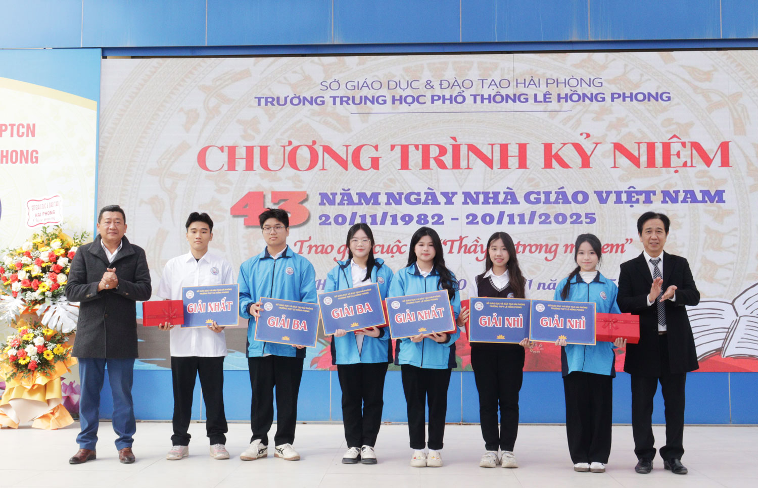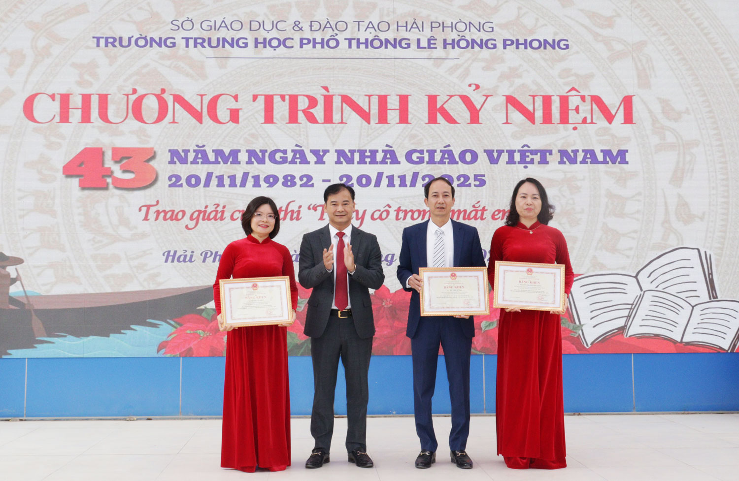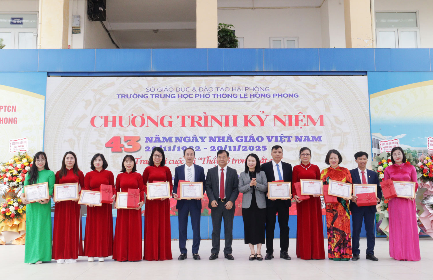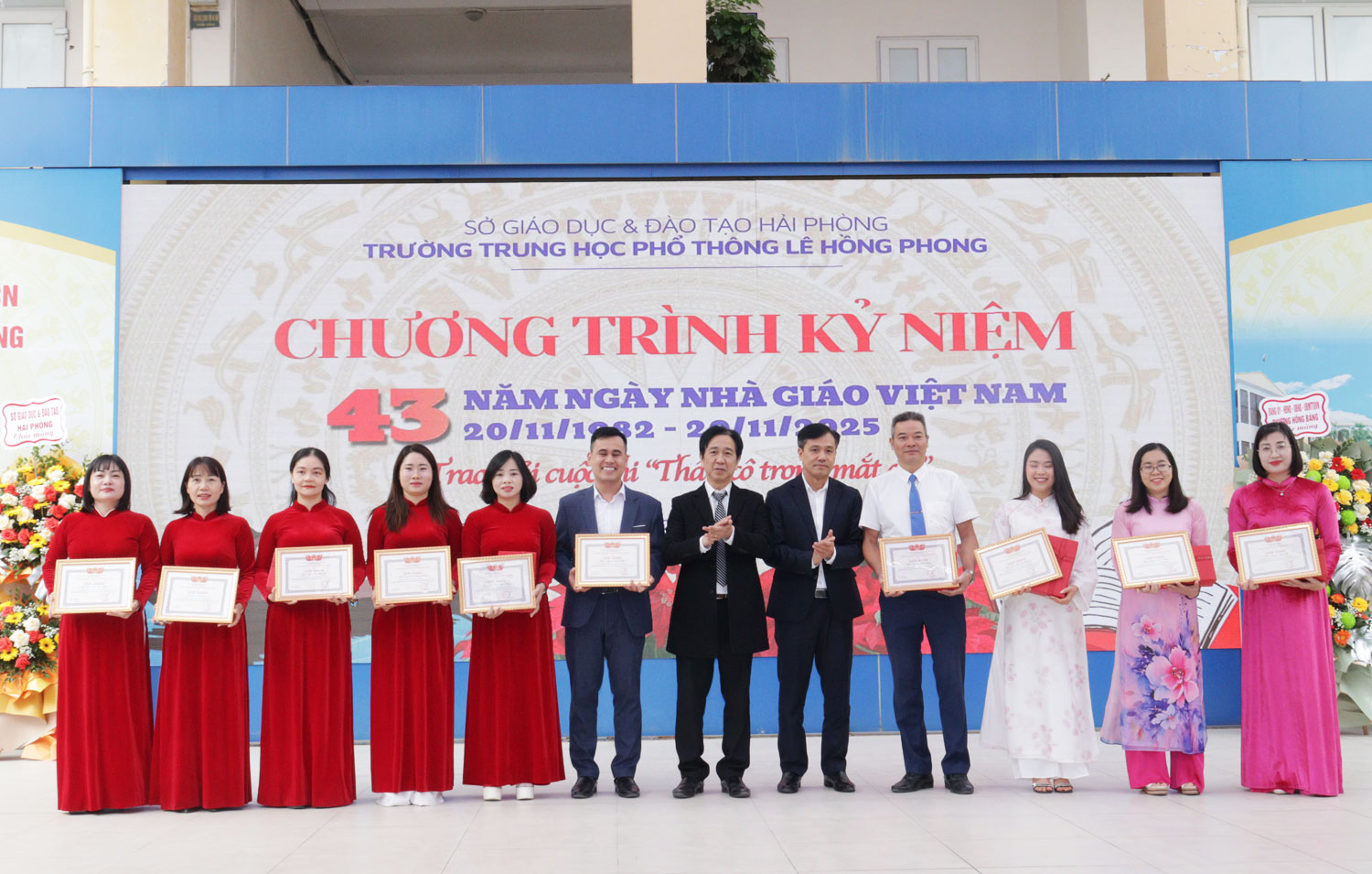 Các cá nhân được nhận Giấy khen của Sở Giáo dục và Đào tạo, phường Hồng Bàng.Nhân kỷ niệm Ngày Nhà giáo Việt Nam (20/11), Hiệu trưởng Trường THPT Lê Hồng Phong bày tỏ niềm tri ân đối với các thế hệ thầy cô, đồng thời mong muốn sẽ nhận được sự quan tâm nhiều hơn nữa từ các cấp lãnh đạo, các ban, ngành, đoàn thể, mong muốn tạo mọi điều kiện tốt nhất cho hội đồng sư phạm nhà trường thực hiện tốt nhiệm vụ của mình, nâng cao chất lượng giáo dục, đào tạo nguồn nhân lực, bồi dưỡng nhân tài cho đất nước.