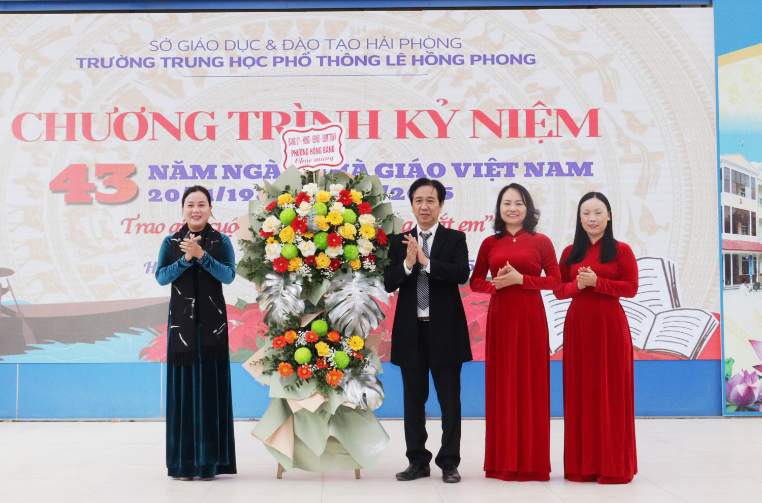 (Haiphong.gov.vn) - Sáng 20/11, Trường THPT Lê Hồng Phong (phường Hồng Bàng) tổ chức kỷ niệm 43 năm Ngày Nhà giáo Việt Nam (20/11/1982 - 20/11/2025) và biểu dương giáo viên đạt thành tích cao năm học 2024 - 2025. Tới dự có các đồng chí: Phạm Hồng Quân, Phó Giám đốc Sở Giáo dục và Đào tạo; Lê Thị Vân, Phó Bí thư Thường trực Đảng ủy, Chủ tịch HĐND phường Hồng Bàng.