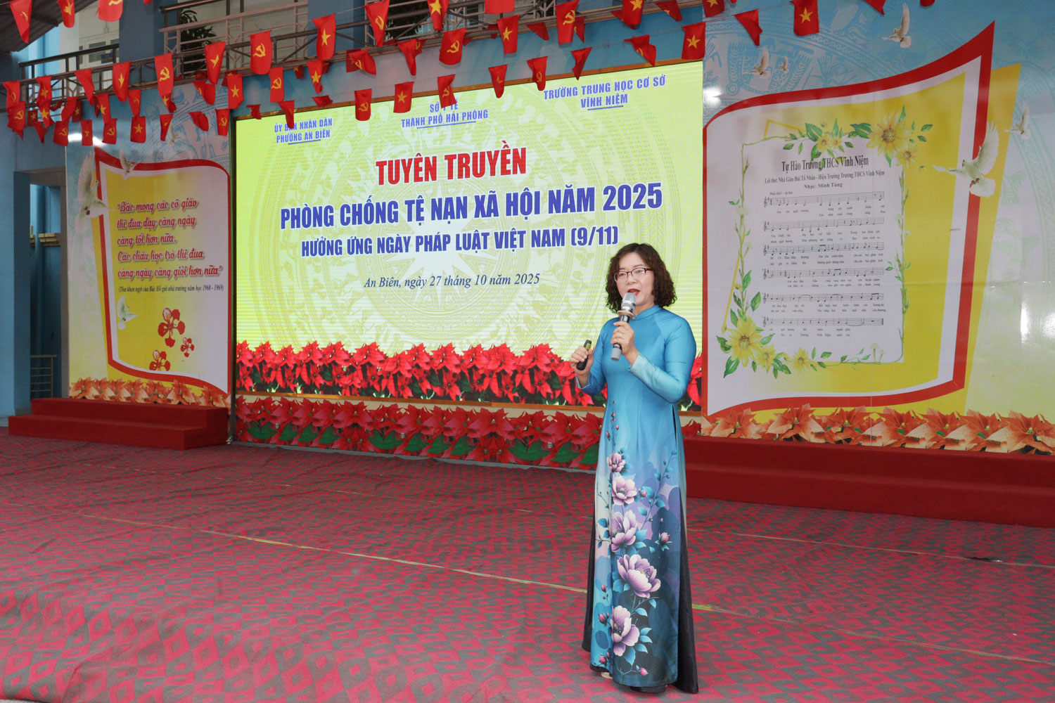 (Haiphong.gov.vn) - Hưởng ứng Ngày pháp luật Việt Nam (9/11), sáng 27/10, phường An Biên tổ chức tuyên truyền, phổ biến pháp luật về phòng chống tệ nạn mại dâm, phòng chống mua bán người năm 2025 cho cán bộ, giáo viên, học sinh Trường THCS Vĩnh Niệm.