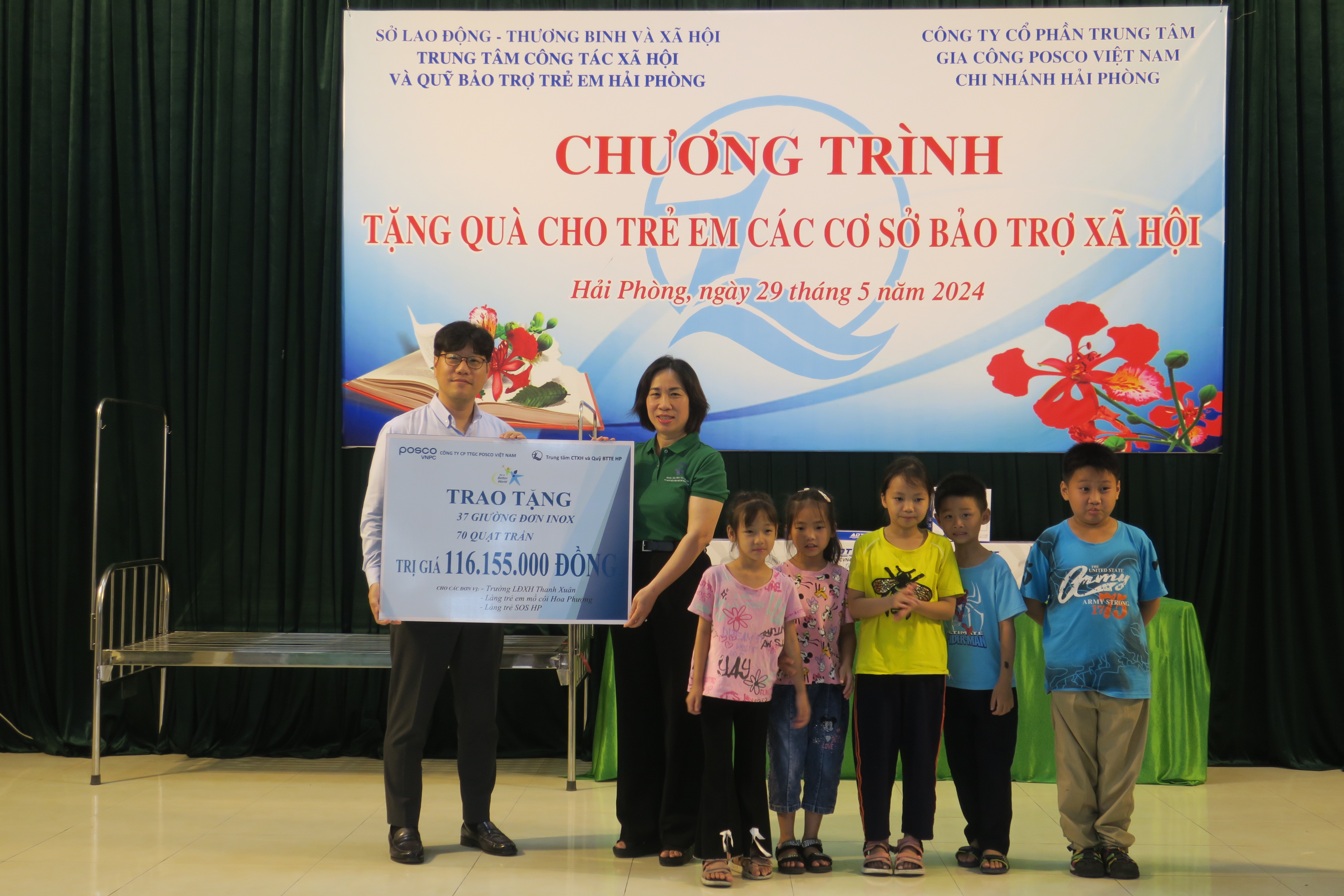 Ông Choi Jin Hyuk, Giám đốc Công ty Cổ phần Trung tâm gia công Posco Việt Nam - Chi nhánh Hải Phòng trao quà tặng.Tại chương trình, ông Choi Jin Hyuk, Giám đốc Công ty Cổ phần Trung tâm gia công Posco Việt Nam - Chi nhánh Hải Phòng đại diện cán bộ, nhân viên Công ty trao tặng trẻ em Làng trẻ em SOS Hải Phòng 63 chiếc quạt trần trị giá 44.100.000 đồng; trao tặng trẻ em Làng nuôi dạy trẻ em mồ côi Hoa Phượng 07 chiếc quạt trần trị giá 4.900.000 đồng; trao tặng trẻ em Trường Lao động xã hội Thanh Xuân 37 chiếc giường đơn trị giá 67.155.000 đồng. Tổng giá trị ghi nhận, ủng hộ Quỹ Bảo trợ trẻ em thành phố Hải Phòng là 116.155.000 đồng.
