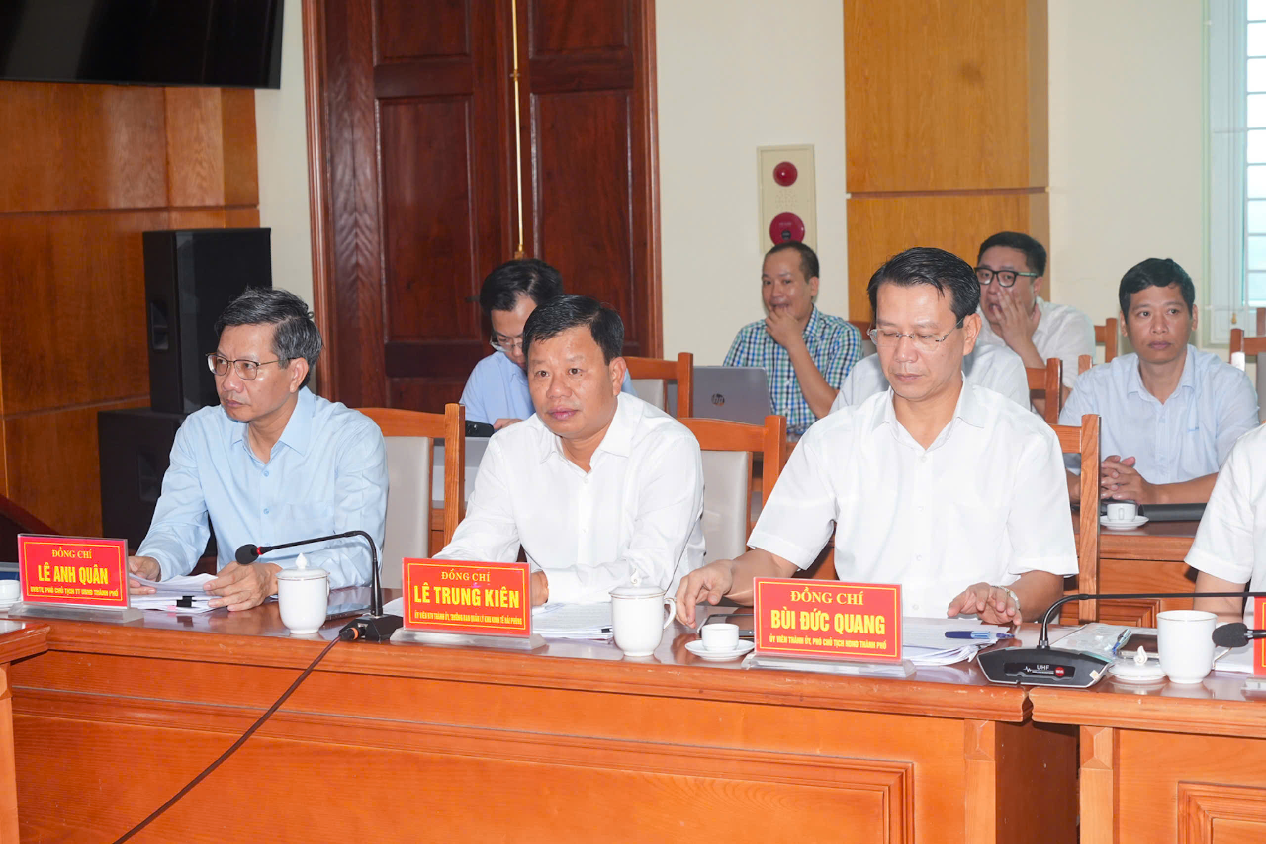Quang cảnh cuộc làm việc.Cùng dự cuộc làm việc có các đồng chí: Lê Anh Quân, Ủy viên Ban Thường vụ Thành ủy, Phó Chủ tịch Thường trực UBND thành phố; Lê Trung Kiên, Ủy viên Ban Thường vụ Thành ủy, Trưởng Ban Quản lý Khu kinh tế Hải Phòng; Bùi Đức Quang, Phó Chủ tịch HĐND thành phố và đại diện lãnh đạo các Sở, ban, ngành, địa phương liên quan.
