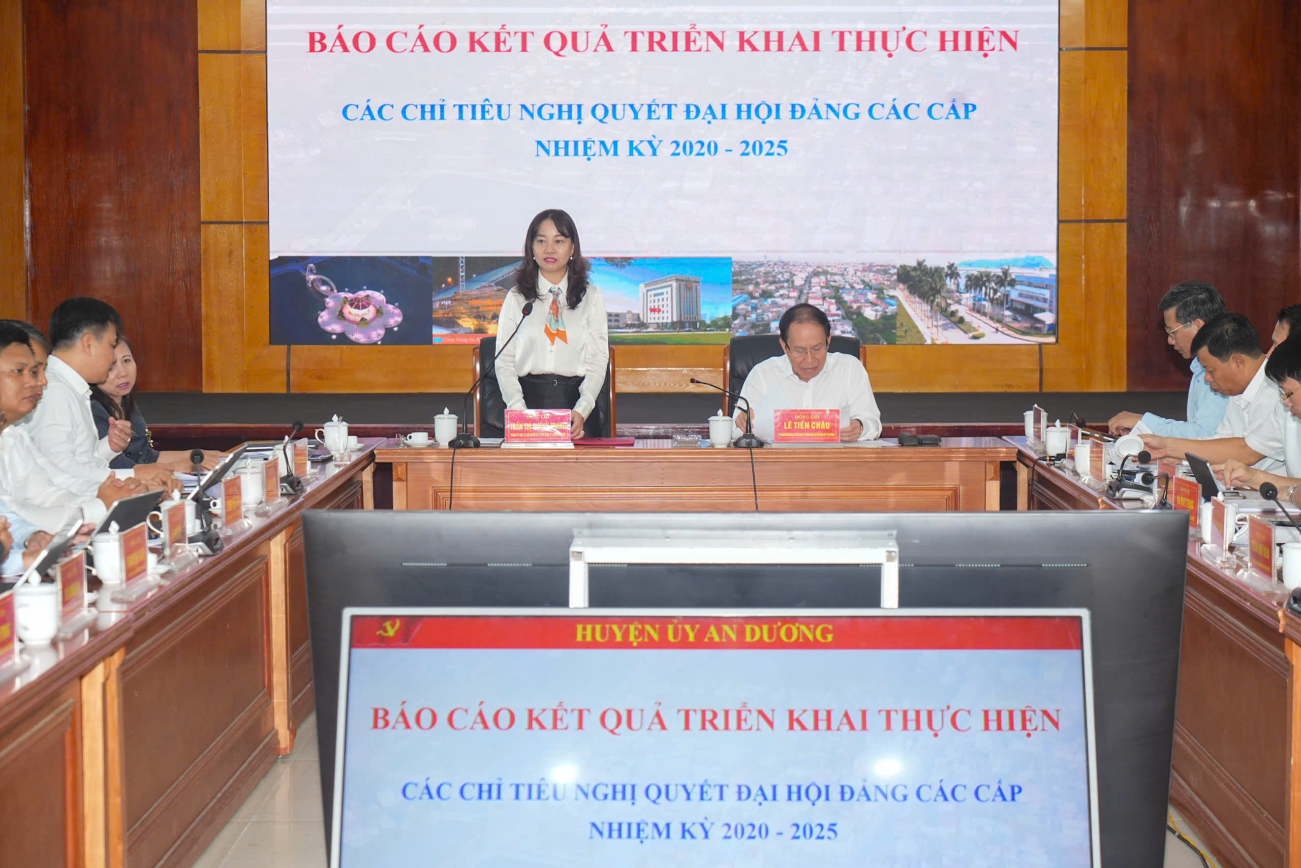 Đồng chí Lê Tiến Châu, Ủy viên Trung ương Đảng, Bí thư Thành ủy, Trưởng Đoàn Đại biểu Quốc hội thành phố Hải Phòng phát biểu chỉ đạo.Sau khi nghe đại diện lãnh đạo các Sở, ngành, địa phương phát biểu; đồng chí Bí thư Thành ủy Lê Tiến Châu ghi nhận huyện An Dương đã cơ bản hoàn thành các chỉ tiêu đề ra, nhiều chỉ tiêu hoàn thành vượt mức so với kế hoạch và cao so với cùng kỳ, nổi bật là chỉ tiêu thu ngân sách, tuy nhiên trong đó tỷ lệ cơ cấu thu về đất tương đối cao. Còn 3 chỉ tiêu theo Nghị quyết Đại hội chưa hoàn thành; công tác quản lý đất đai, trật tự xây dựng còn nhiều tồn tại; công tác giải ngân vốn đầu tư công còn hạn chế.