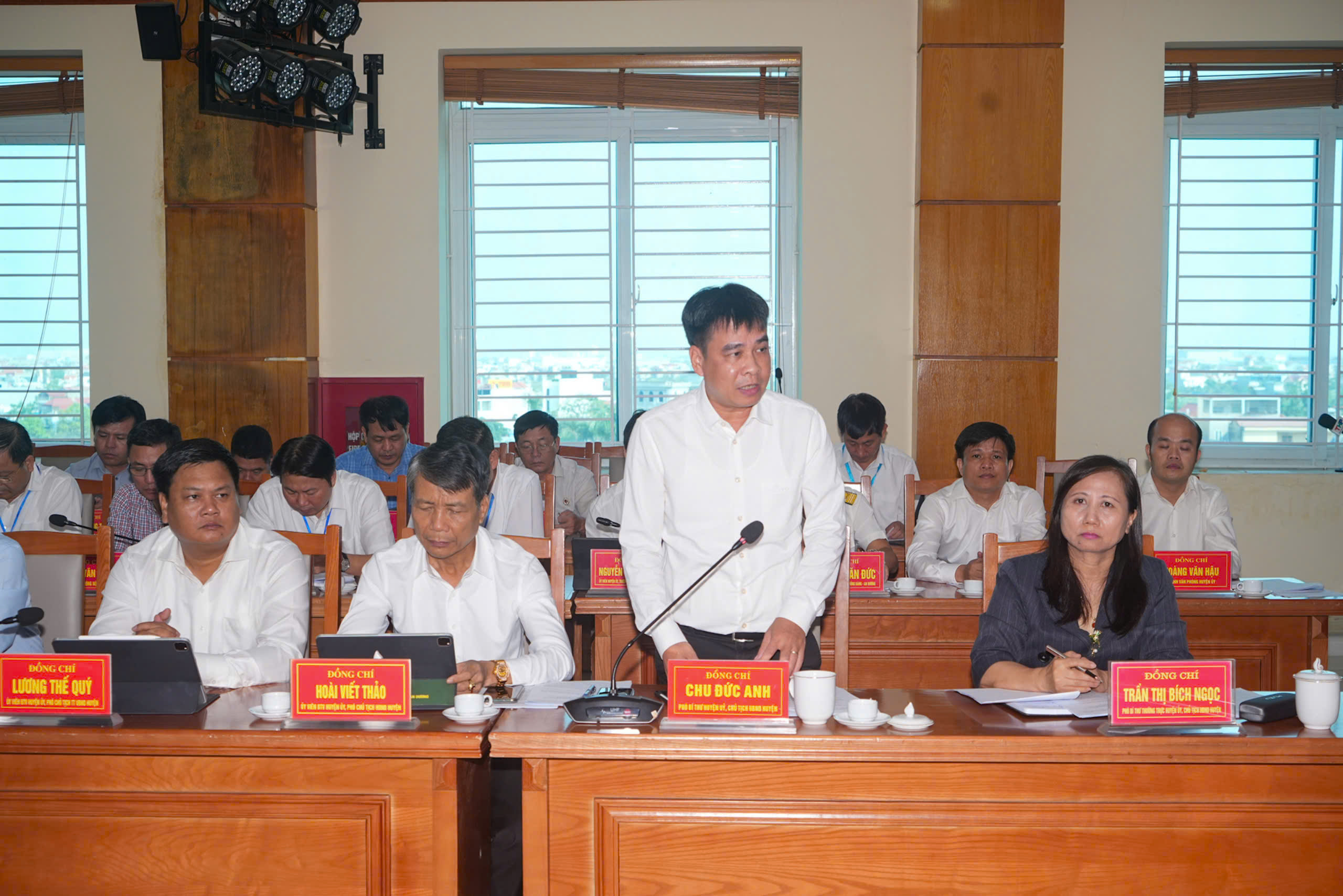 Các đồng chí lãnh đạo dự cuộc làm việc.Giai đoạn 2020 - 2024, huyện đã hoàn thành 15/18 chỉ tiêu về xây dựng Đảng và phát triển kinh tế - xã hội, quốc phòng - an ninh theo Nghị quyết Đại hội XVIII, trong đó 4 chỉ tiêu vượt cao, về đích trước kế hoạch Đại hội là chỉ tiêu tăng trưởng tổng thu cân đối ngân sách nhà nước bình quân ước đạt 104,84%/năm, vượt 84,84% chỉ tiêu Nghị quyết Đại hội; đến năm 2023 có 50/50 trường mầm non, tiểu học, THCS công lập đạt chuẩn quốc gia, về đích trước chỉ tiêu Nghị quyết Đại hội 2 năm; đến tháng 9/2023, toàn huyện kết nạp thêm 932 đảng viên, đạt 109% so với chỉ tiêu Nghị quyết, đạt 103% so với Nghị quyết Đại hội đã được điều chỉnh, bổ sung; thành lập được 10 tổ chức Đảng trong các loại hình doanh nghiệp ngoài Nhà nước, hợp tác xã, đơn vị sự nghiệp ngoài công lập, hoàn thành chỉ tiêu điều chỉnh giữa nhiệm kỳ.