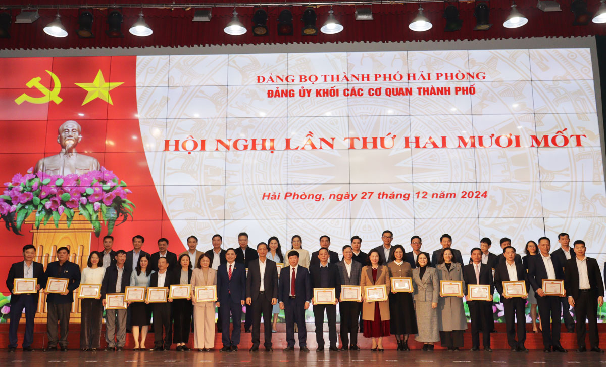 (Haiphong.gov.vn) - Chiều 27/12, Đảng ủy Khối các cơ quan thành phố tổ chức Hội nghị Ban Chấp hành lần thứ 21 (mở rộng) tổng kết công tác xây dựng đảng; tổng kết công tác kiểm tra, giám sát và thi hành kỷ luật; tổng kết công tác dân vận; biểu dương, khen thưởng tổ chức đảng đạt “Trong sạch vững mạnh tiêu biểu” và mô hình “Dân vận khéo” năm 2024. Đồng chí Đỗ Mạnh Hiến, Phó Bí Thư Thường trực Thành ủy dự và chỉ đạo Hội nghị.