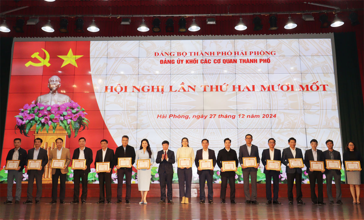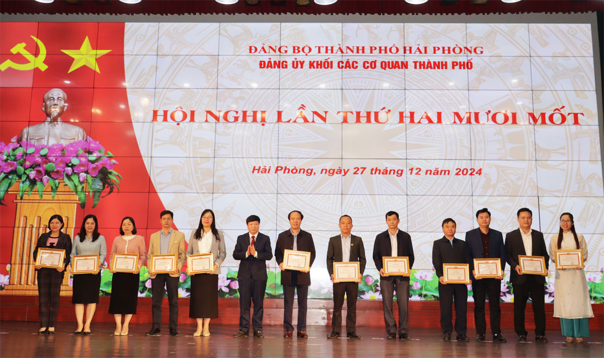 Trao Giấy khen cho các tập thể, cá nhân có mô hình “Dân vận khéo” tiêu biểu năm 2024.Nhân dịp này, Đảng ủy Khối các cơ quan thành phố biểu dương, khen thưởng 34 chi, đảng bộ đạt “Trong sạch vững mạnh tiêu biểu” và tặng Giấy khen cho 26 tập thể, 2 cá nhân có mô hình “Dân vận khéo” tiêu biểu năm 2024.