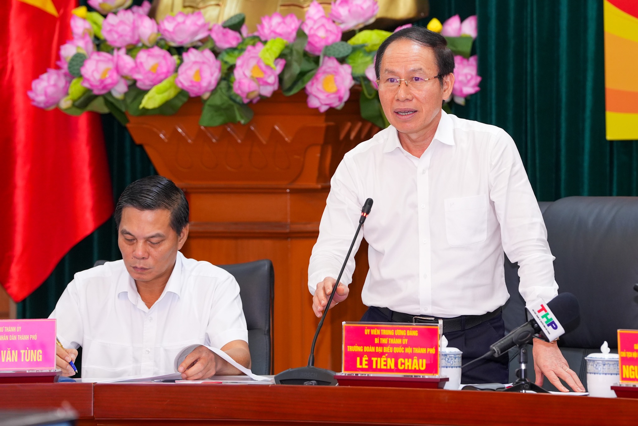 Đồng chí Lê Tiến Châu, Bí thư Thành ủy, Trưởng Đoàn ĐBQH Hải Phòng phát biểu tại cuộc làm việc.Tại cuộc làm việc, lãnh đạo Thành uỷ Hải Phòng đã báo cáo về kết quả 40 năm thực hiện đường lối đổi mới của Đảng tại thành phố; việc thực hiện các nhiệm vụ phát triển kinh tế - xã hội trong nhiệm kỳ Đại hội đại biểu toàn quốc lần thứ XIII của Đảng và nhiệm kỳ Đại hội Đảng bộ thành phố lần thứ XVI; công tác bảo đảm quốc phòng, an ninh, tăng cường đối ngoại; xây dựng, chỉnh đốn Đảng và hệ thống chính trị; các định hướng phát triển của thành phố trong thời gian tới.