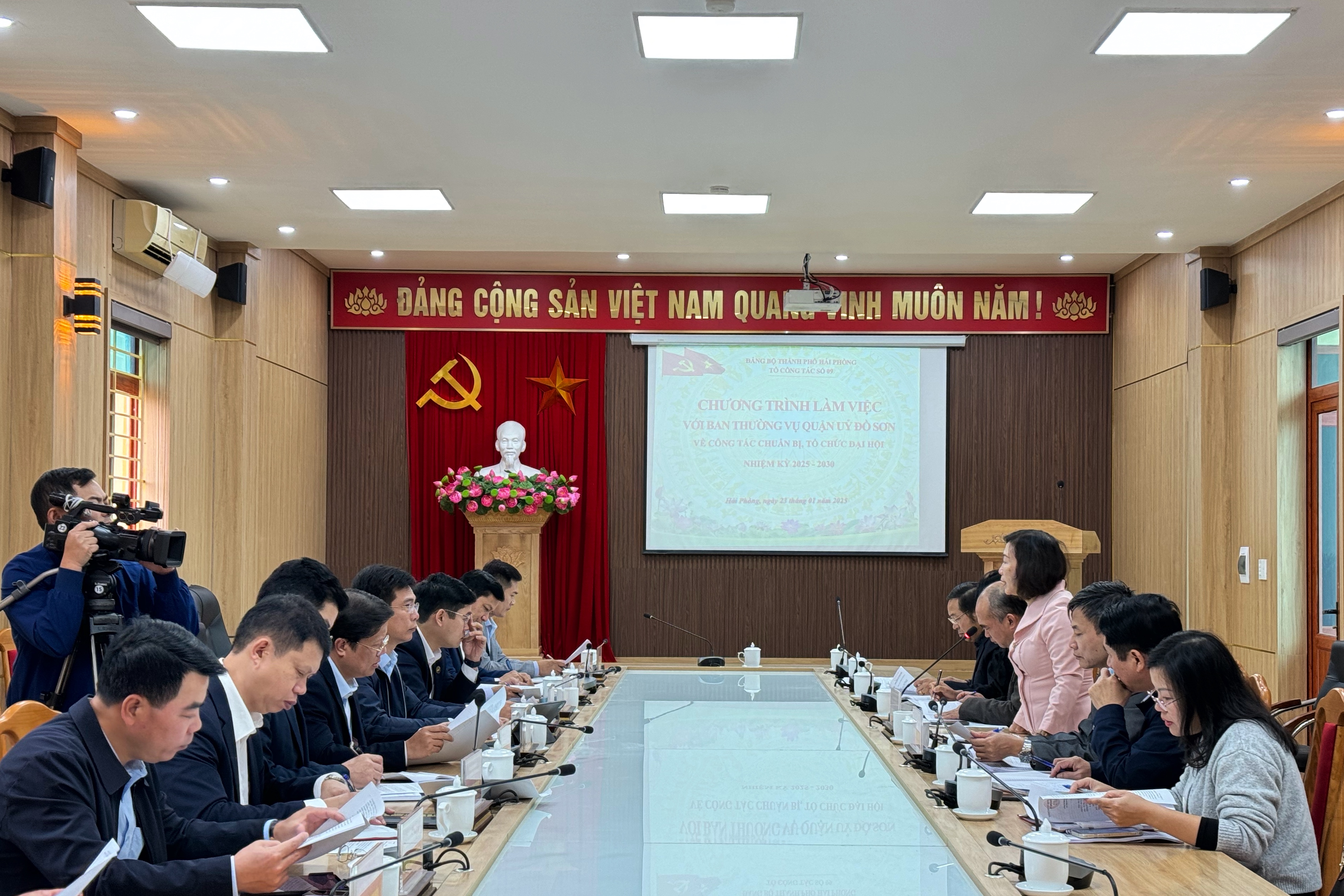 (Haiphong.gov.vn) - Sáng 23/1, Tổ công tác số 9 của Ban Thường vụ Thành ủy do đồng chí Đào Khánh Hà, Uỷ viên Ban Thường vụ Thành ủy, Trưởng Ban Tuyên giáo Thành ủy làm Tổ trưởng làm việc với Ban Thường vụ Quận ủy Đồ Sơn về công tác chuẩn bị, tổ chức Đại hội nhiệm kỳ 2025 - 2030.