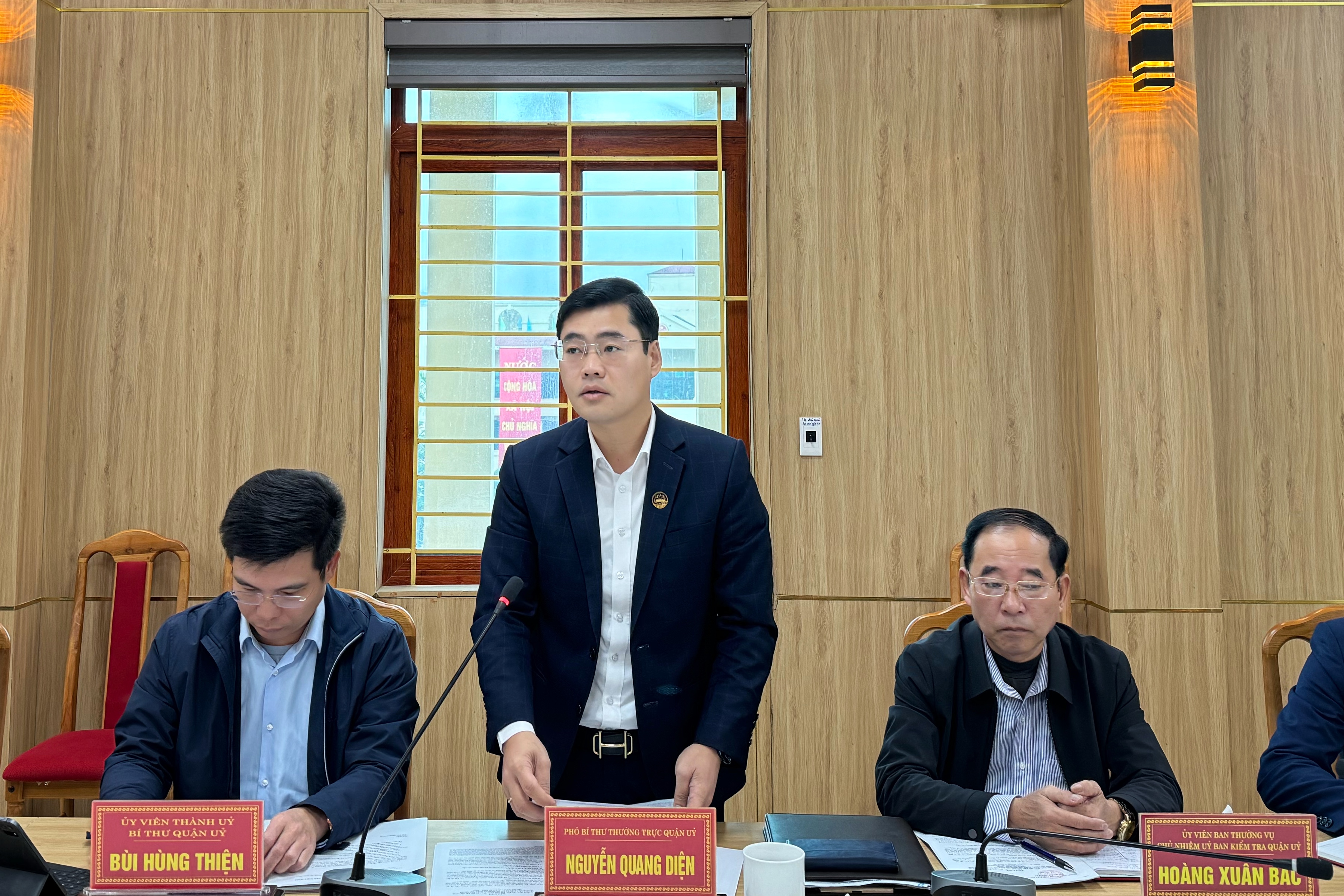 Đồng chí Nguyễn Quang Diện, Phó Bí thư Thường trực Quận uỷ Đồ Sơn phát biểu tại Hội nghị. Về tiến độ, đến thời điểm này, đối với chi bộ trực thuộc đảng ủy cơ sở có 78/116 chi bộ tổ chức đại hội, đạt tỷ lệ 67,2,8%. Trong đó, quận chọn 2 đơn vị tổ chức Đại hội điểm gồm: Đảng bộ phường Vạn Hương (thí điểm bầu bí thư trực tiếp tại Đại hội), Đảng bộ Trung tâm Y tế quận và dự kiến hoàn thành trước 28/02/2025; các chi, đảng bộ còn lại dự kiến hoàn thành trước 15/3/2025. Đại hội Đảng bộ quận Đồ Sơn lần thứ 26 dự kiến hoàn thành trước 31/7/2025.