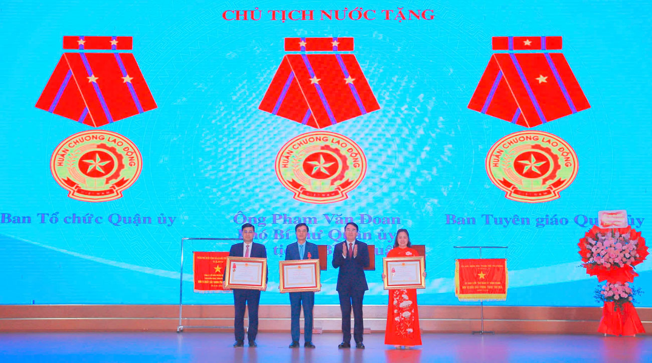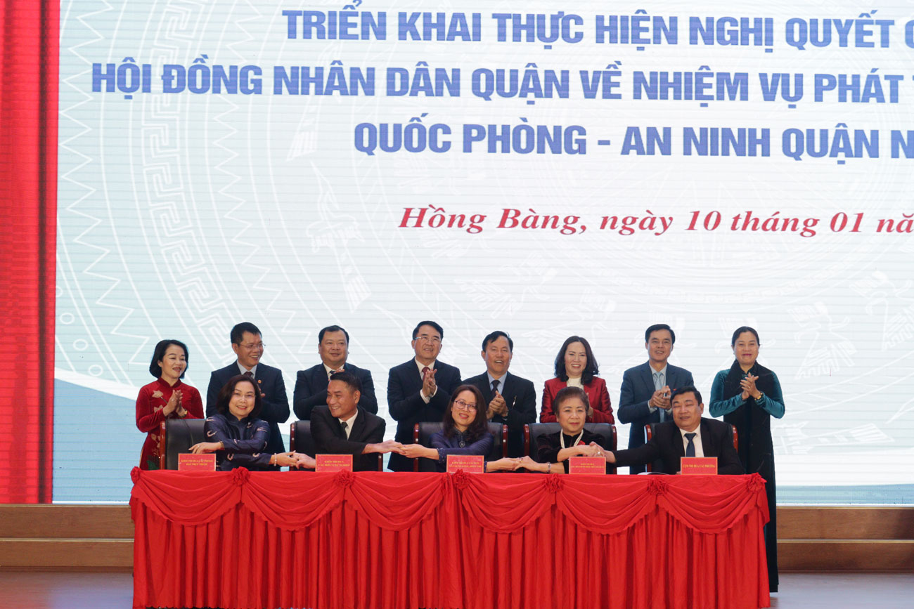 Phó Chủ tịch UBND thành phố Lê Khắc Nam trao Cờ thi đua và Bằng khen của UBND thành phố cho các tập thể.Giới thiệu việc làm cho 5.000 lượt lao động trở lên; Không phát sinh hộ nghèo theo chuẩn nghèo đa chiều giai đoạn 2021 - 2025; Tỷ lệ người dân tham gia mua bảo hiểm y tế đạt 95,5% trở lên; Hoàn thành 100% chỉ tiêu tuyển chọn, gọi công dân nhập ngũ và công dân thực hiện nghĩa vụ tham gia Công an nhân dân; Hoàn thành nhiệm vụ phân loại đơn vị hành chính quận và 04 phường mới; Phấn đấu đứng đầu thành phố về chỉ số Cải cách hành chính khối quận, huyện; Hoàn thành 100% chỉ tiêu kết nạp đảng viên mới do Thành uỷ giao; Hoàn thành 100% chỉ tiêu do Thành uỷ giao về thành lập tổ chức đảng trong doanh nghiệp ngoài nhà nước, hợp tác xã và đơn vị sự nghiệp ngoài công lập theo Nghị quyết số 28-NQ/TU của Ban Thường vụ Thành ủy.