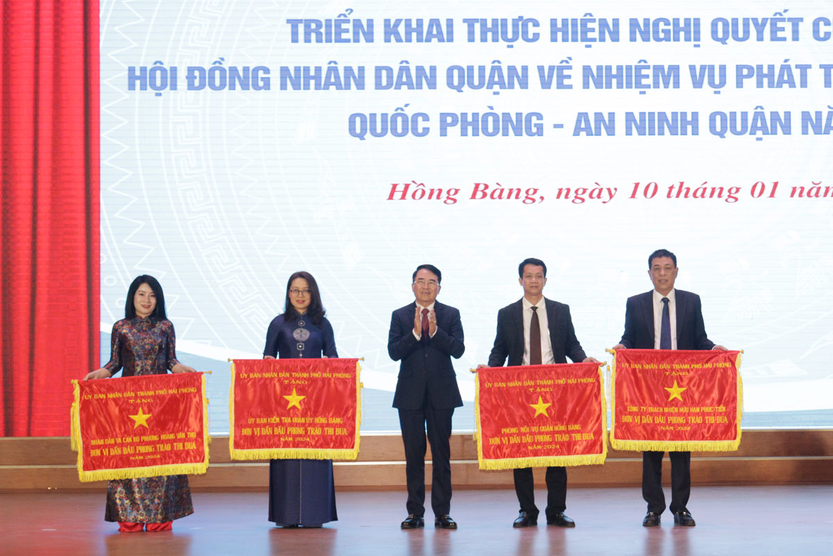 Phó Chủ tịch UBND thành phố Lê Khắc Nam trao Huân chương Lao động hạng Nhì và Huân chương Lao động hạng Ba của Chủ tịch nước cho các tập thể, cá nhân.Năm 2025, quận Hồng Bàng đề ra 17 chỉ tiêu, nhiệm vụ, giải pháp, trong đó: Giá trị sản xuất công nghiệp (do quận quản lý) đạt 315,8 tỷ đồng; tổng mức lưu chuyển và bán lẻ hàng hóa 70.168 tỷ đồng trở lên; doanh thu dịch vụ lưu trú và ăn uống 9.421 tỷ đồng trở lên; tổng thu ngân sách nhà nước trên địa bàn quận đạt 1.630 tỷ 901 triệu đồng trở lên; tổng mức đầu tư toàn xã hội phục vụ chỉnh trang và phát triển đô thị đạt 12.900 tỷ đồng, trong đó: nguồn vốn từ ngân sách đạt 408 tỷ đồng. Vốn đầu tư thực hiện các dự án, công trình từ nguồn vốn ngân sách do quận quản lý đạt 331 tỷ đồng; 100% hộ dân có nhu cầu xây dựng, cải tạo nhà ở đủ điều kiện được cấp giấy phép xây dựng; đảm bảo duy trì 100% các tiêu chí tuyến đường kiểu mẫu theo quy định của thành phố; Điểm trung bình thi vào lớp 10 THPT đứng tốp đầu thành phố. Xây dựng trường Mầm non Sở Dầu và trường Tiểu học Ngô Gia Tự đạt chuẩn Quốc gia.