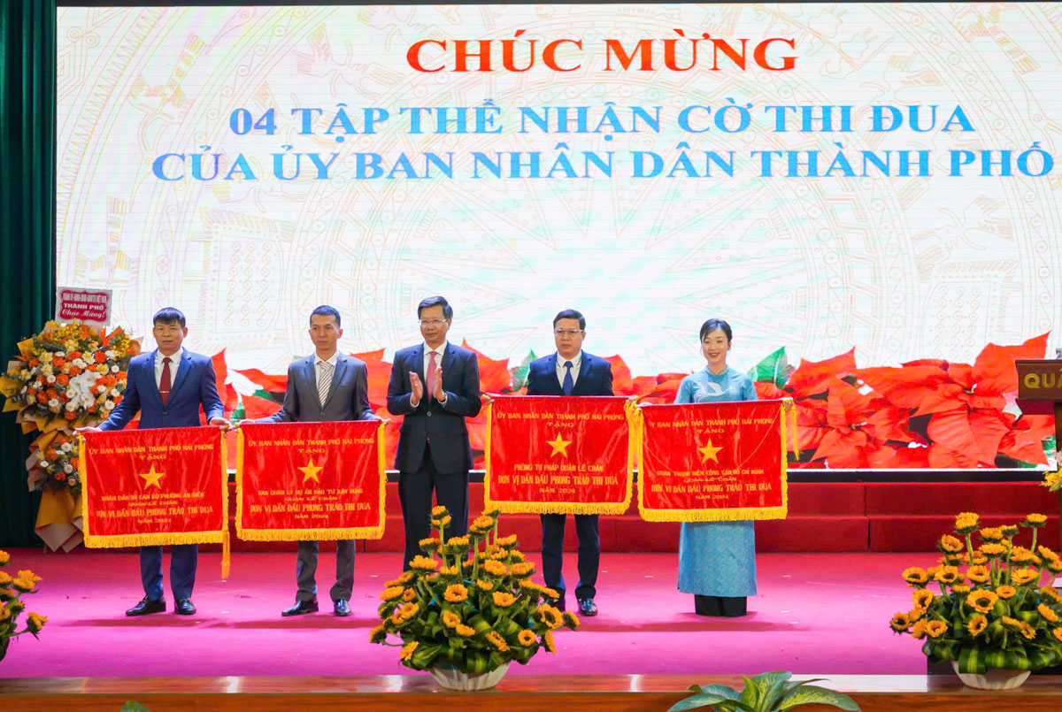 Phó Chủ tịch Thường trực UBND thành phố Lê Anh Quân trao Cờ thi đua của thành phố cho các tập thể.Công tác giải phóng mặt bằng thực hiện các dự án trên địa bàn quận được tập trung cao, chủ động, quyết liệt. Đã hoàn thành giải phóng mặt bằng đối với 04 dự án; thực hiện đấu giá thành công 04 dự án. Chỉ đạo tập trung giải ngân vốn đầu tư công. Đã chỉ đạo quyết liệt công tác chỉnh trang đô thị, bảo đảm an toàn giao thông, trật tự đường hè, vệ sinh môi trường, mỹ quan đô thị, quản lý trật tự xây dựng. Công tác quản lý quy hoạch, kiến trúc được quan tâm thực hiện; phê duyệt 17 đồ án quy hoạch chi tiết tỷ lệ 1/500 phục vụ các dự án đầu tư xây dựng. Lập 7 đồ án điều chỉnh cục bộ quy hoạch chi tiết tỷ lệ 1/2000 quận Lê Chân đến năm 2025 phục vụ các dự án phát triển kinh tế - xã hội trên địa bàn, trong đó đã được UBND thành phố phê duyệt 05 đồ án, 02 đồ án đang triển khai thực hiện.