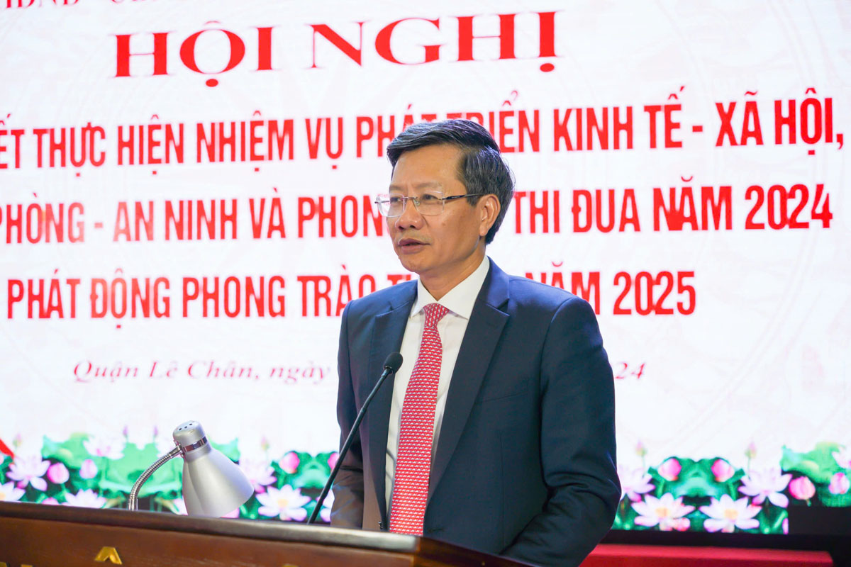 Phó Chủ tịch Thường trực UBND thành phố Lê Anh Quân phát biểu chỉ đạo tại Hội nghị.Phát biểu chỉ đạo tại Hội nghị, Phó Chủ tịch Thường trực UBND thành phố Lê Anh Quân ghi nhận, biểu dương các kết quả nổi bật mà quận Lê Chân đã đạt được trong năm 2024, đặc biệt là công tác phòng, chống bão số 3 và thu ngân sách, giải phóng mặt bằng. Để thực hiện thắng lợi các nhiệm vụ đặt ra trong năm 2025, Phó Chủ tịch Thường trực UBND thành phố đề nghị Đảng bộ, chính quyền và Nhân dân quận Lê Chân phải tiếp tục đoàn kết, nỗ lực phấn đấu với quyết tâm chính trị cao nhất; trong đó tập thể lãnh đạo Quận ủy - HĐND - UBND quận phải năng động, đổi mới, sáng tạo trong triển khai các nhiệm vụ. Đồng thời sớm khắc phục những tồn tại, hạn chế đã được chỉ ra, coi đó là những nhiệm vụ trọng tâm cần thực hiện trong thời gian tới.
