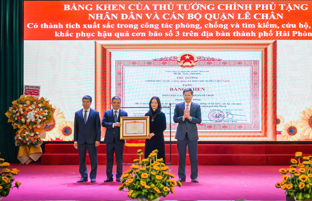 Các tập thể, cá nhân được khen thưởng.Nhân dịp này, Nhân dân và cán bộ quận Lê Chân được Thủ tướng Chính phủ tặng Bằng khen có thành tích xuất sắc trong công tác phòng, chống, khắc phục hậu quả cơn Bão số 3 trên địa bàn. Trường Tiểu học Võ Thị Sáu được Chủ tịch nước tặng thưởng Huân chương Lao động hạng Nhì; Trường THCS Trần Phú được tặng Cờ thi đua Chính phủ; 02 cá nhân được tặng Bằng khen của Thủ tướng Chính phủ. 34 lượt tập thể được tặng Cờ thi đua của thành phố, danh hiệu Tập thể lao động xuất sắc; 18 tập thể và 53 cá nhân được tặng thưởng Bằng khen của UBND thành phố; danh hiệu “Chiến sĩ thi đua cấp thành phố”.