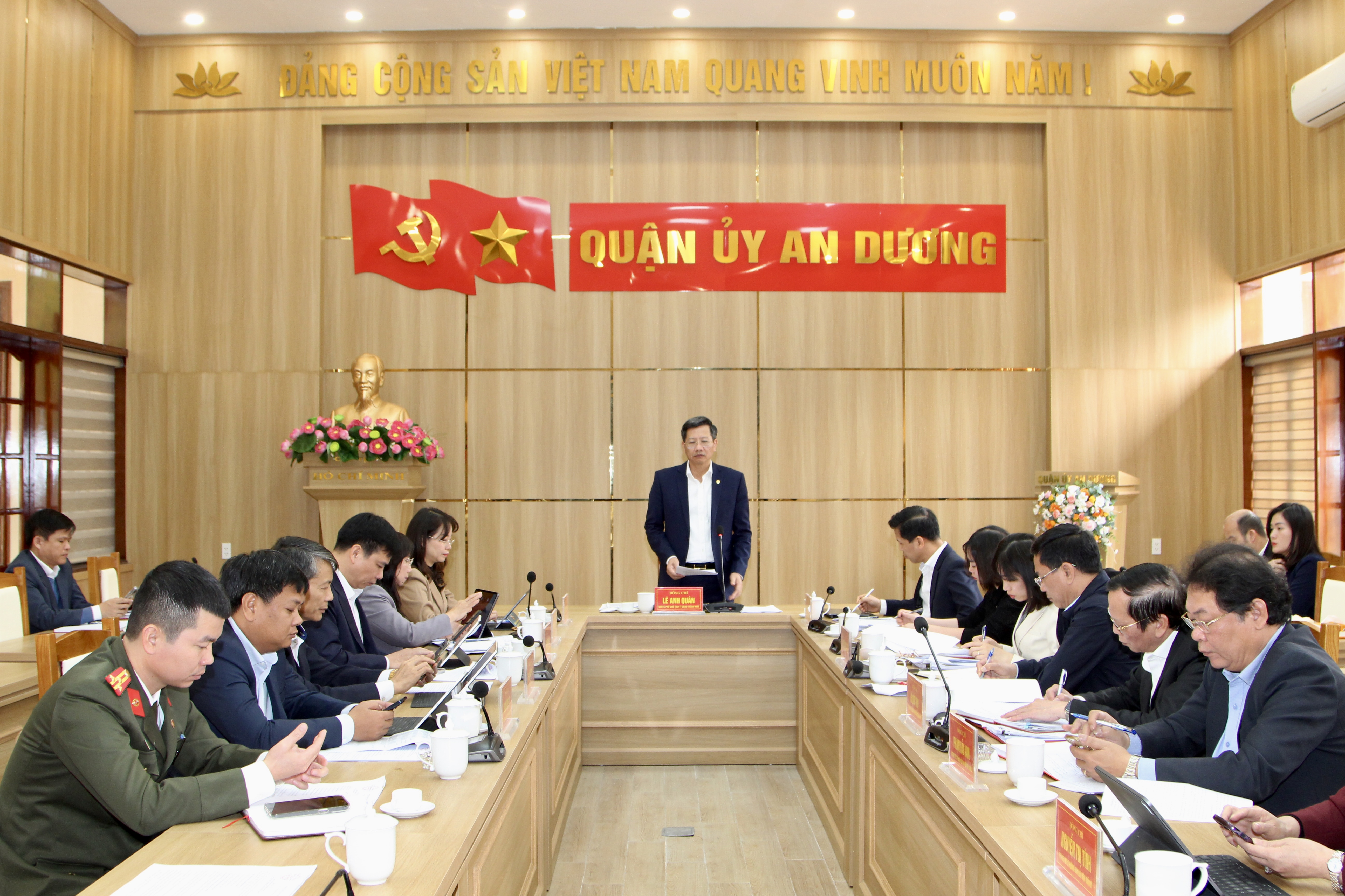 Đồng chí Lê Anh Quân, Phó Chủ tịch Thường trực UBND thành phố kết luận Hội nghị.Kết luận cuộc làm việc, đồng chí Lê Anh Quân, Phó Chủ tịch Thường trực UBND thành phố, Tổ trưởng Tổ công tác ghi nhận, đánh giá cao công tác lãnh đạo, chỉ đạo tổ chức Đại hội Đảng bộ các cấp nhiệm kỳ 2025-2030 của Quận ủy An Dương. Đồng chí đề nghị thời gian tới, Quận ủy, Ban Thường vụ Quận ủy tiếp tục bám sát chỉ đạo, hướng dẫn của Trung ương, Thành ủy, tập trung cao công tác lãnh đạo, chỉ đạo tổ chức thành công Đại hội Đảng các chi, đảng bộ trực thuộc; Đại hội Đảng bộ quận nhiệm kỳ 2025-2030, bảo đảm tiến độ đề ra. Tập trung hoàn thiện các văn kiện Đại hội Đảng bộ quận nhiệm kỳ 2025-2030, trong đó, rà soát, đánh giá kỹ các chỉ tiêu Đại hội Đảng bộ nhiệm kỳ trước đã đề ra; trên cơ sở đó, xây dựng dự thảo báo cáo chính trị trình tại Đại hội bám sát thực tiễn, nhiệm vụ và yêu cầu phát triển của quận trong giai đoạn mới, rõ mục tiêu, phương hướng, nhiệm vụ, chỉ tiêu và các khâu đột phá. Đồng thời, thực hiện tốt công tác chuẩn bị nhân sự bảo đảm đúng các quy định, chặt chẽ trong các quy trình, bảo mật thông tin…Đối với các kiến nghị của Quận ủy An Dương, Tổ công tác tiếp thu báo cáo Thành ủy để có chỉ đạo tháo gỡ kịp thời. Đồng chí Lê Anh Quân cũng lưu ý Quận ủy thường xuyên thông tin báo cáo Tổ công tác về tiến độ thực hiện công tác lãnh đạo, chỉ đạo tổ chức Đại hội Đảng các cấp trên địa bàn để kịp thời phản ánh khó khăn, vướng mắc cũng như đề xuất các giải pháp tháo gỡ./.