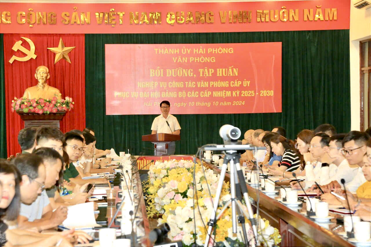 (Haiphong.gov.vn) - Sáng 10/10, Văn phòng Thành ủy tổ chức Hội nghị bồi dưỡng, tập huấn nghiệp vụ công tác văn phòng cấp ủy phục vụ Đại hội Đảng bộ các cấp, tiến tới Đại hội Đảng bộ thành phố lần thứ XVII, nhiệm kỳ 2025-2030.