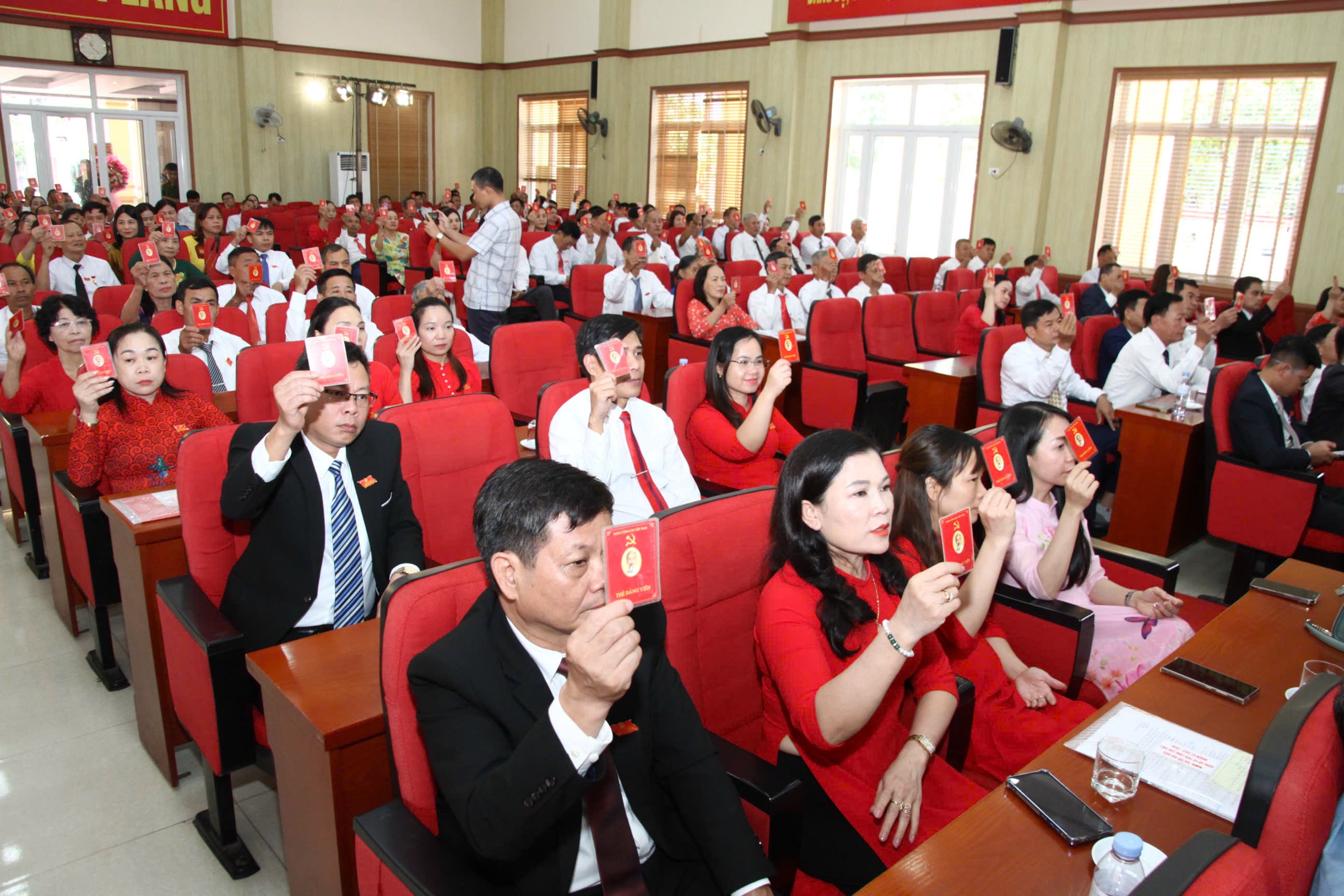 Các đại biểu biểu quyết tại Đại hội.Đồng chí Trưởng Ban Nội chính Thành uỷ đề nghị Đảng bộ cần tập trung thực hiện tốt mục tiêu, phương hướng, nhiệm vụ, giải pháp của nhiệm kỳ tới. Đại hội đã xác định các chỉ tiêu cơ bản, 03 khâu đột phá và các giải pháp chủ yếu là khá toàn diện trên các lĩnh vực; cơ bản đã bám sát tình hình thực tế đặt ra nhằm tạo bước đột phá trong phát triển kinh tế, xã hội, xây dựng Đảng trong sạch, vững mạnh, điều đó thể hiện quyết tâm rất cao của toàn Đảng bộ và Nhân dân trong toàn xã.