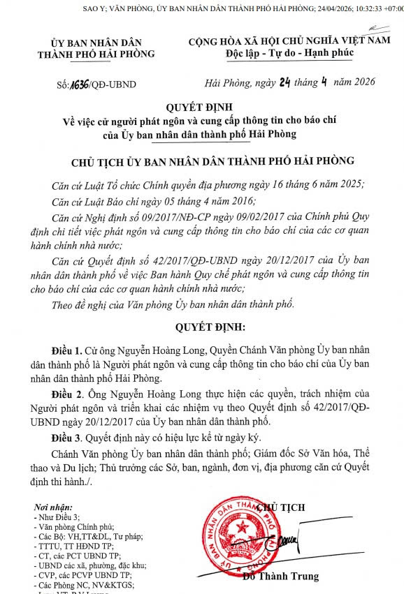 UBND thành phố Quyết định cử ông Nguyễn Hoàng Long, Quyền Chánh Văn phòng UBND thành phố là Người phát ngôn và cung cấp thông tin cho báo chí của UBND thành phố Hải Phòng.