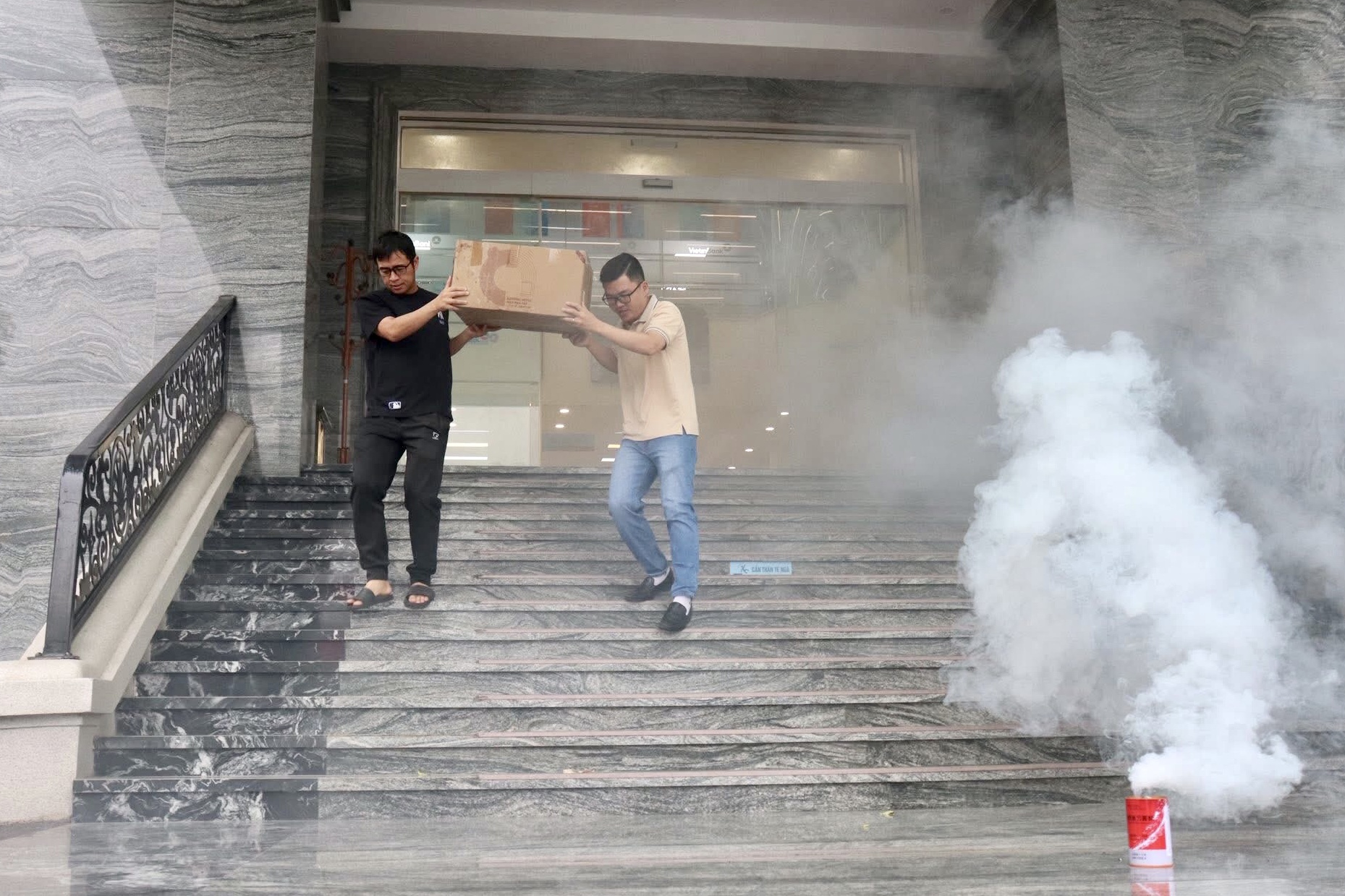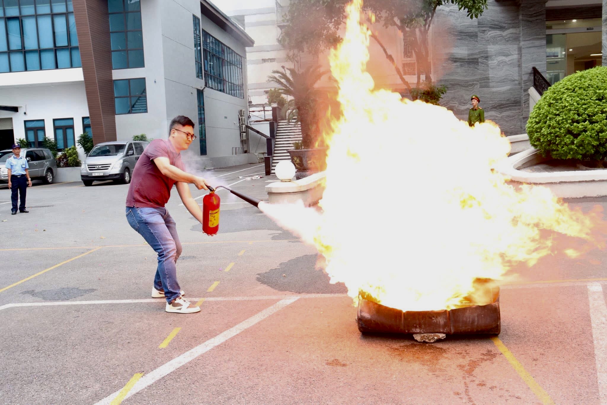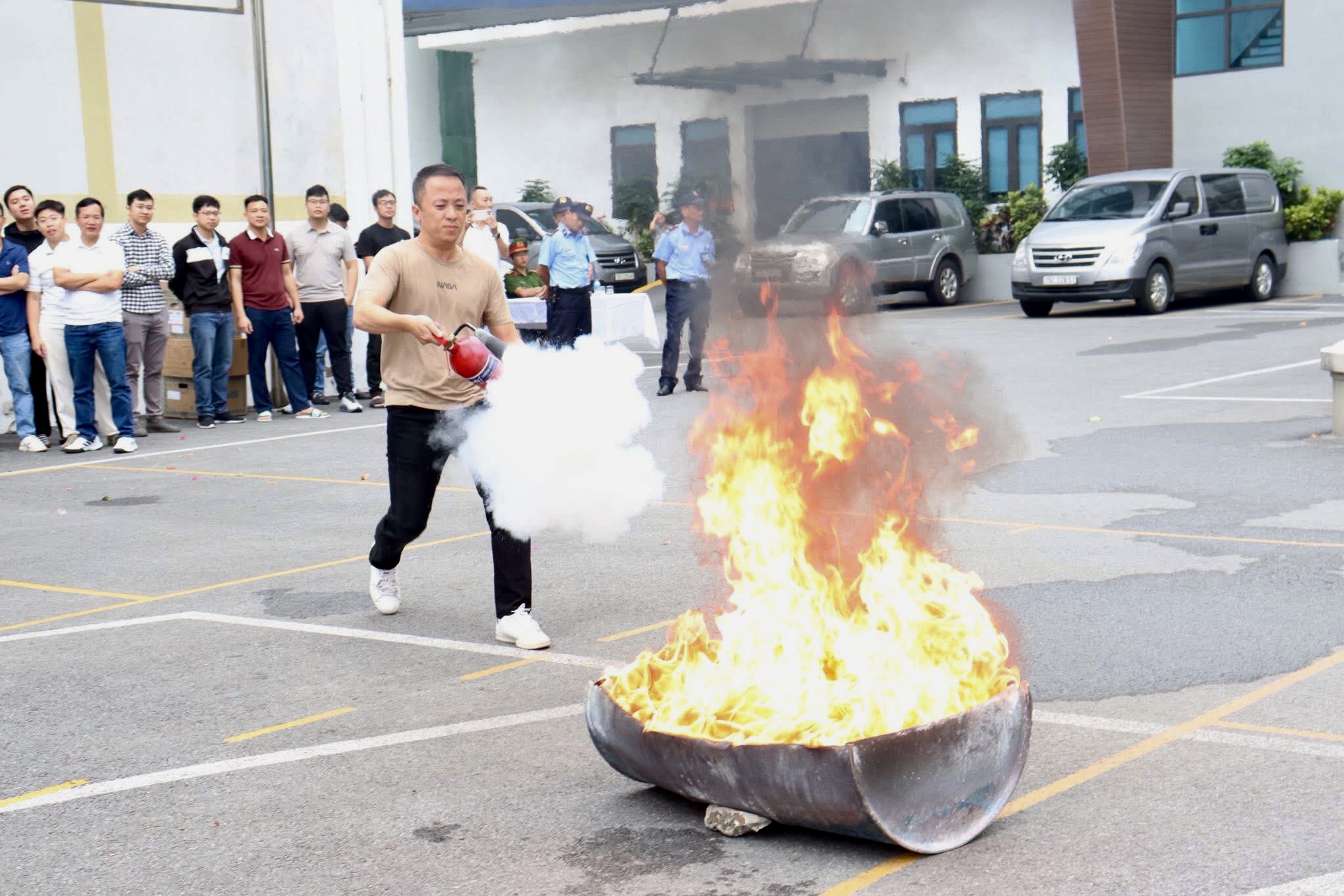 Một số hình ảnh tại cuộc diễn tập.Tình huống giả định: Sau khi kết thúc ngày làm việc, nhân viên khóa cửa, không tắt toàn bộ hệ thống điện. Bên trong còn quạt điện vẫn hoạt động, do sự cố về điện dẫn đến cháy thiết bị và gây cháy lan sang các vật liệu dễ cháy khác. Khi xảy ra cháy, do thời gian phát hiện ra cháy muộn dẫn đến đám cháy đã cháy lan, diện tích rộng, phát triển nhanh tỏa ra nhiệt lượng lớn, nhiều khói, khí độc bao phủ toàn bộ phòng. Đám cháy với nhiệt tăng cao, truyền nhiệt sang các gian phòng liền kề, tác động đến tính toàn vẹn của vật liệu ngăn cách, tính cách nhiệt của cấu kiện không hiệu quả, có nguy cơ cháy lan sang các khu vực xung quanh.