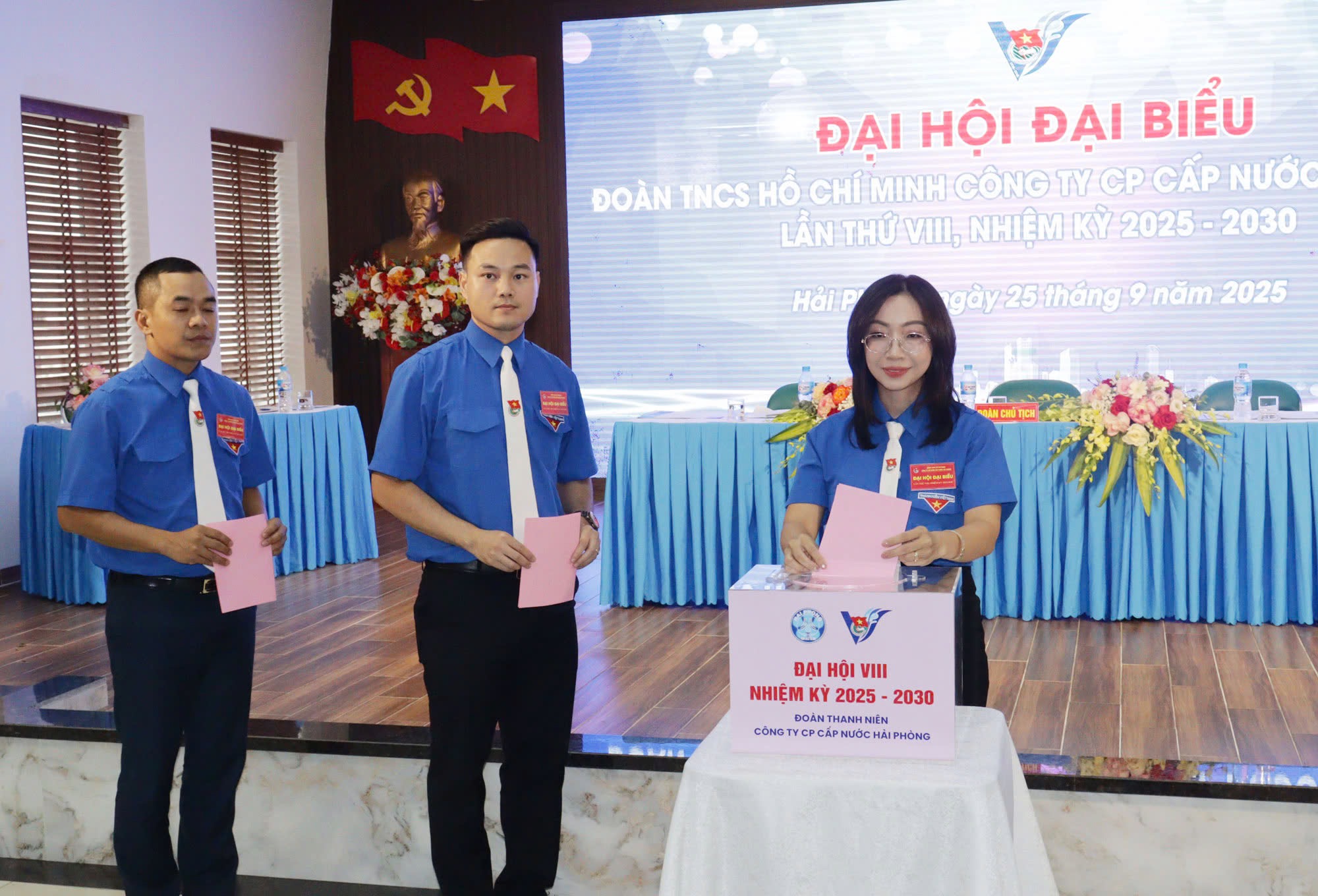 Các đại biểu bỏ phiếu bầu tại Đại hội.Nhiệm kỳ 2025 - 2030, Đoàn TNCS Hồ Chí Minh Công ty CP Cấp nước Hải Phòng xác định mục tiêu: Xây dựng lớp thanh niên có lý tưởng cách mạng, giàu lòng yêu nước, trung thực, tiên phong, gương mẫu, đoàn kết, sáng tạo; thi đua học tập rèn luyện kỹ năng nghiệp vụ chuyên môn, làm chủ khoa học, công nghệ hiện đại; phát huy tinh thần tình nguyện, xung kích trong sự nghiệp đẩy mạnh công nghiệp hóa, hiện đại hóa và hội nhập quốc tế; nâng cao chất lượng và hoạt động của tổ chức Đoàn; tích cực tham gia xây dựng Đảng, góp phần vào sự nghiệp phát triển bền vững của Công ty.