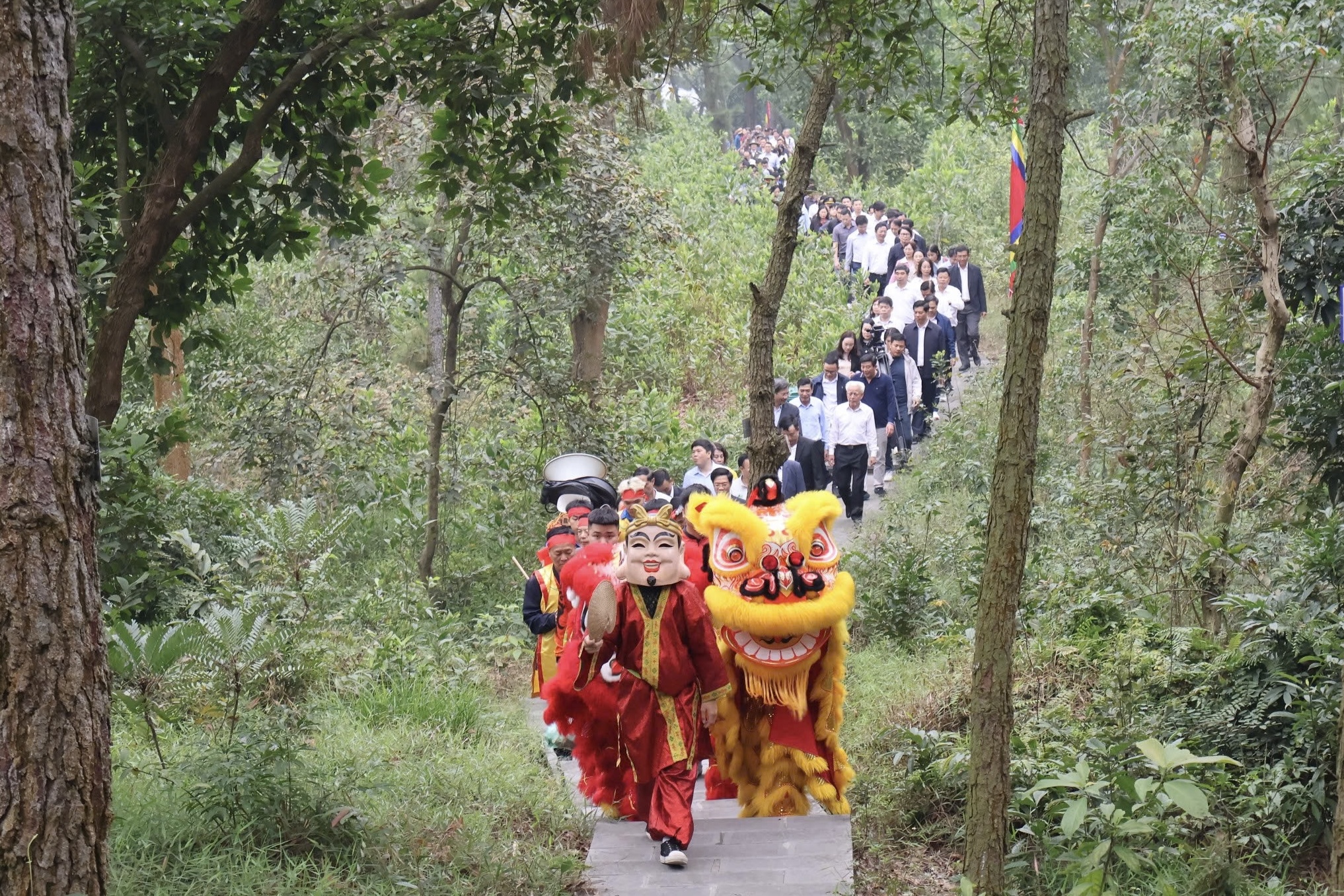 Đoàn lễ trên đường tới dâng hương tại các miếuTrong không khí linh thiêng của núi Ngũ Nhạc, đội lân, đội rước cờ dẫn đầu Đoàn lễ đi trong tiếng chiêng trống rộn ràng.