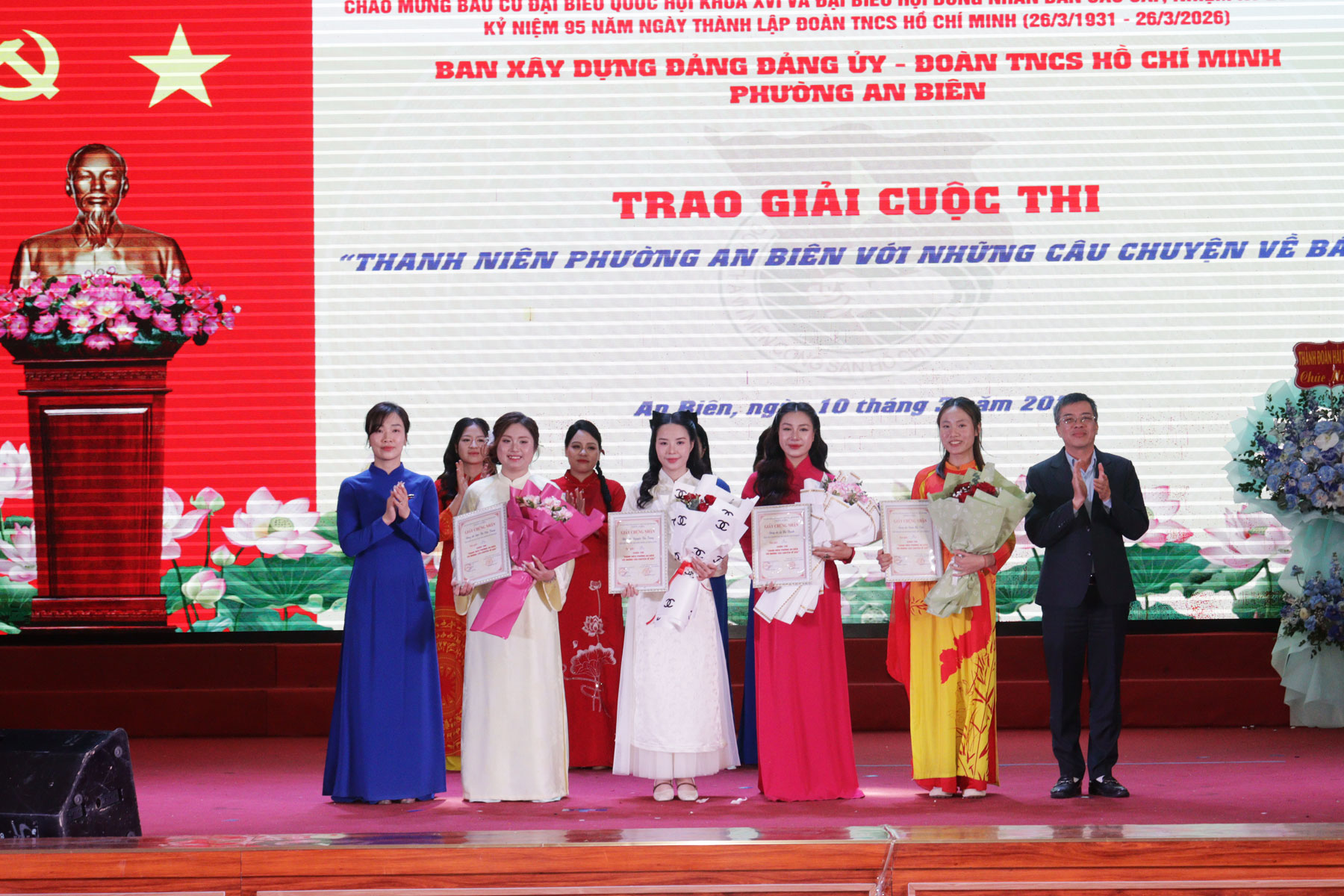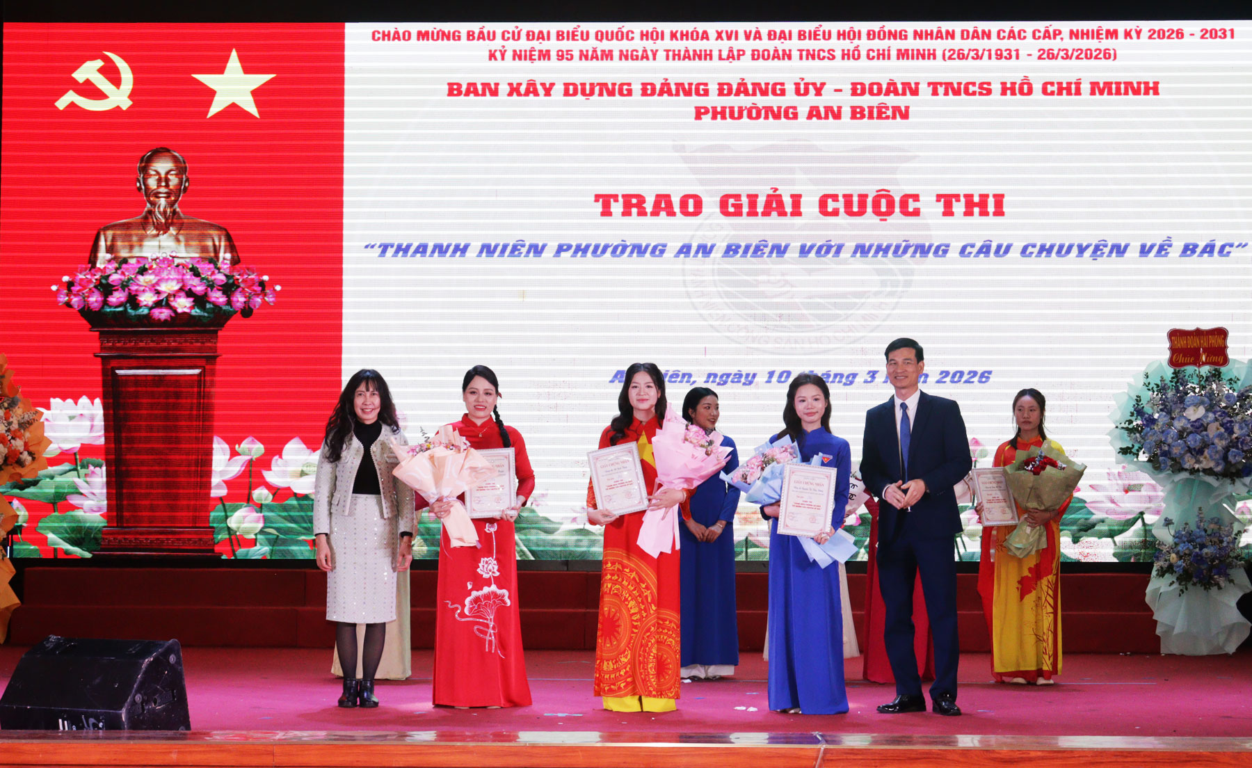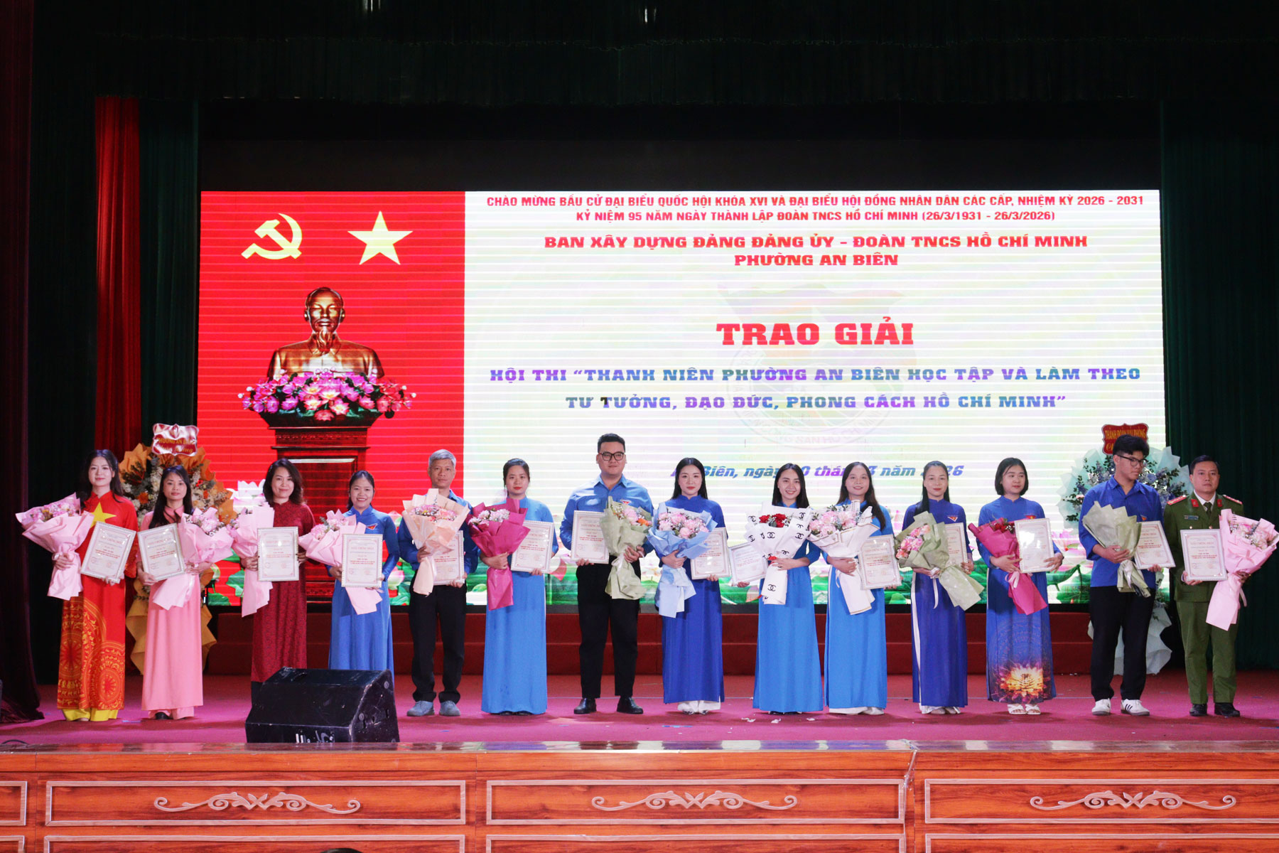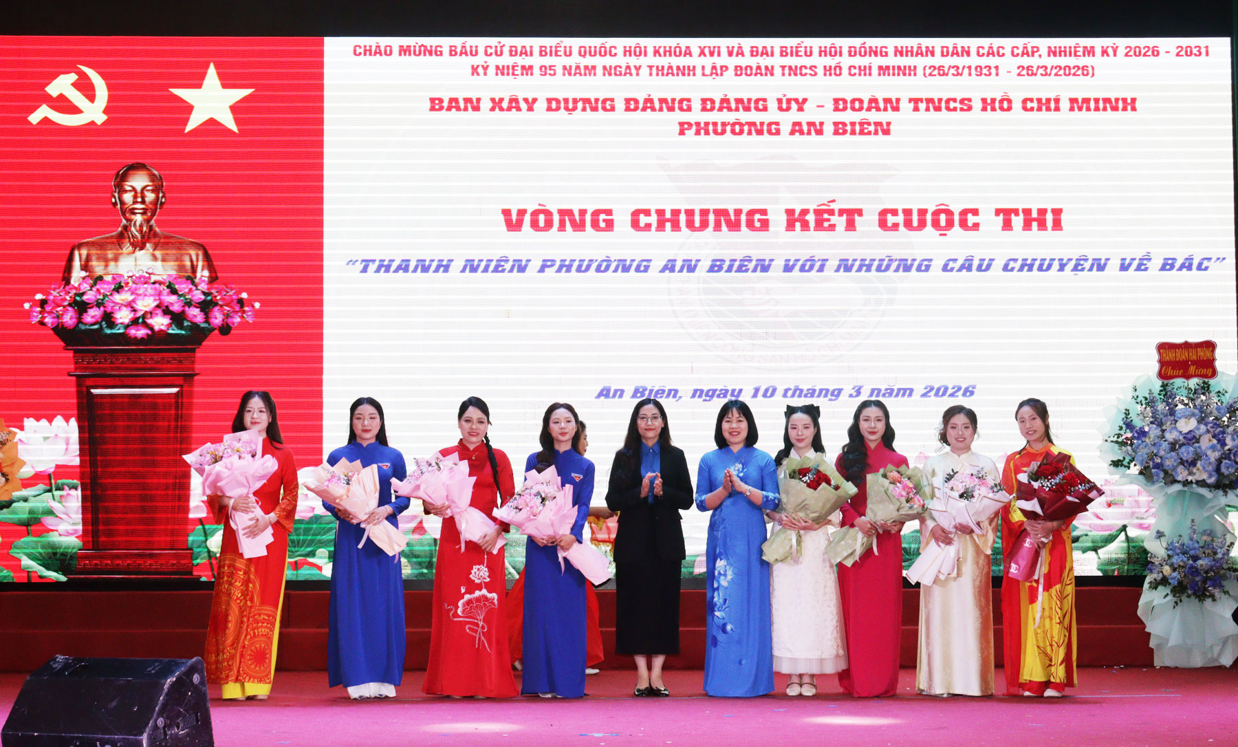 Tặng hoa cho các thí sinh tham gia Hội thi “Thanh niên phường An Biên học tập và làm theo tư tưởng, đạo đức, phong cách Hồ Chí Minh”.Hội thi “Thanh niên phường An Biên học tập và làm theo tư tưởng, đạo đức, phong cách Hồ Chí Minh” nhằm tạo đợt sinh hoạt chính trị sâu rộng, giúp cán bộ, đoàn viên thanh niên nhận thức sâu sắc hơn về những nội dung cơ bản và giá trị to lớn của tư tưởng, đạo đức, phong cách Hồ Chí Minh. Hội thi được diễn ra từ ngày 2/2/2026 với sự tham gia của 18 thí sinh đến từ các cơ sở Đoàn - Hội trực thuộc trên địa bàn phường và đã lựa chọn được 8 thí sinh tham gia tranh tài tại Vòng chung kết hôm nay.