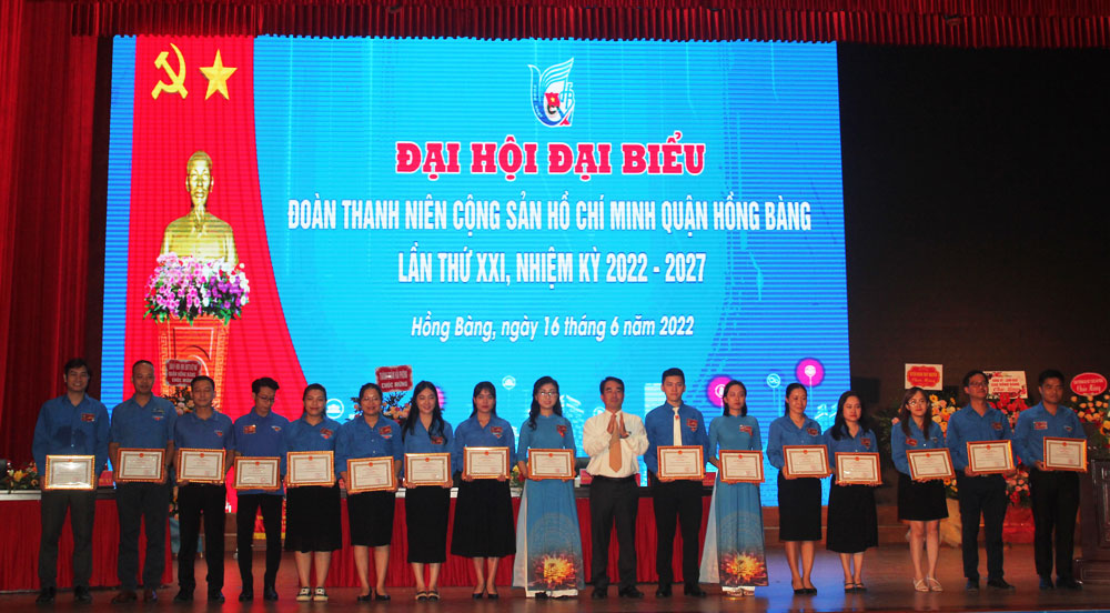 Chủ tịch UBND quận Hồng Bàng cũng tặng Giấy khen cho 8 tập thể, 10 cá nhân thuộc Đoàn TNCS Hồ Chí Minh quận Hồng Bàng đạt thành tích xuất sắc trong nhiệm kỳ 2017 - 2022.