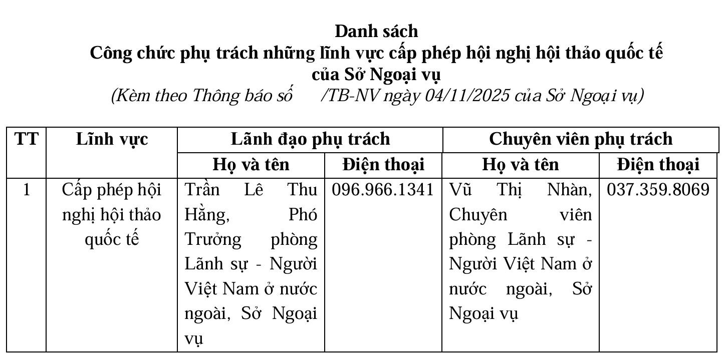 (Haiphong.gov.vn) - Danh sách công chức phụ trách những lĩnh vực cấp phép hội nghị, hội thảo quốc tế của Sở Ngoại vụ: