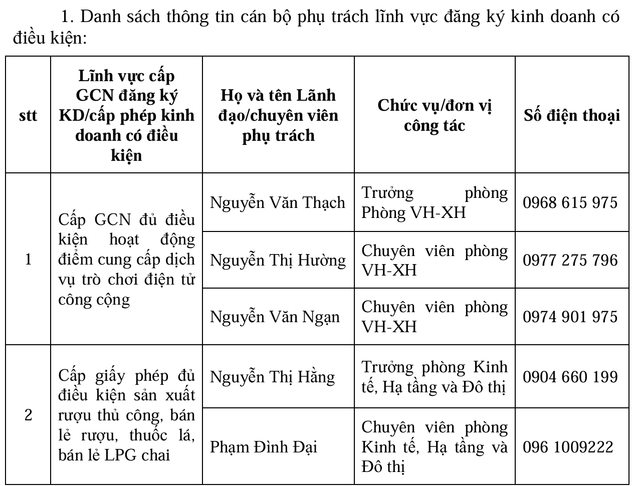 Danh sách thông tin cán bộ phụ trách cấp Giấy chứng nhận đăng ký kinh doanh có điều kiện tại UBND phường Phạm Sư Mạnh