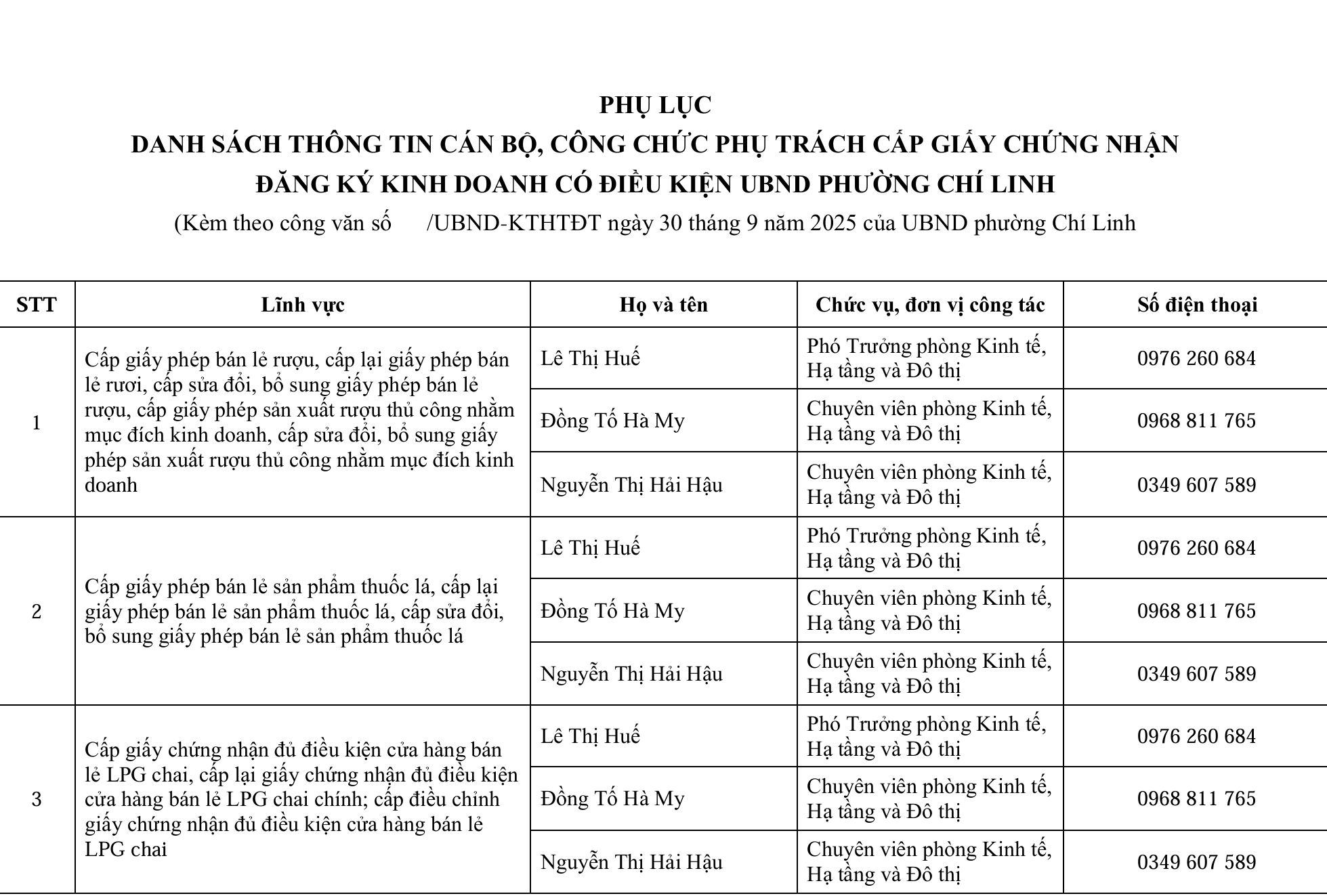 Danh sách thông tin cán bộ phụ trách lĩnh vực đăng ký kinh doanh, cấp phép đăng ký kinh doanh có điều kiện tại UBND phường Chí Linh