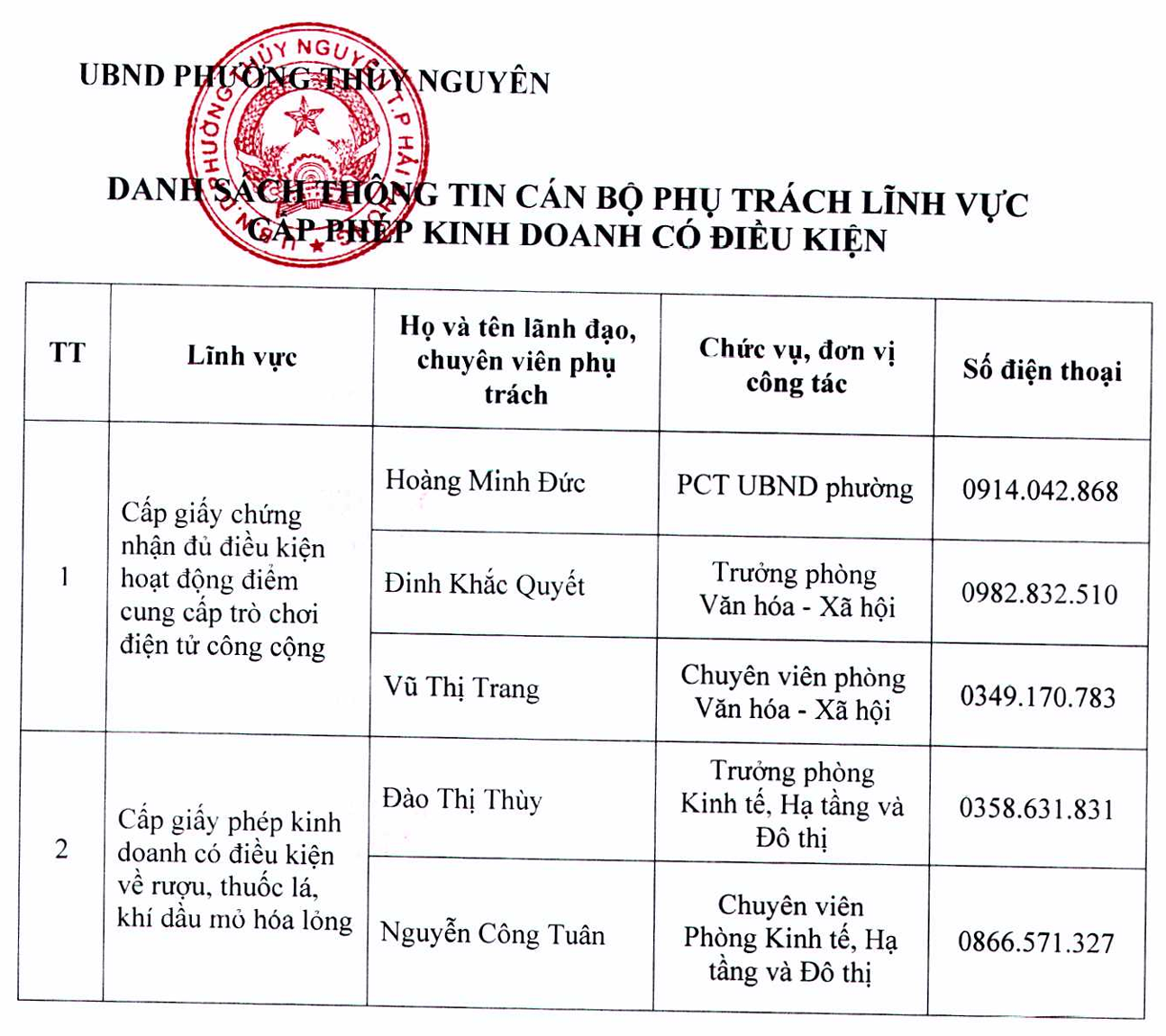 (Haiphong.gov.vn) - Danh sách thông tin lãnh đạo, công chức phụ trách lĩnh vực cấp phép kinh doanh có điều kiện phường Thủy Nguyên: