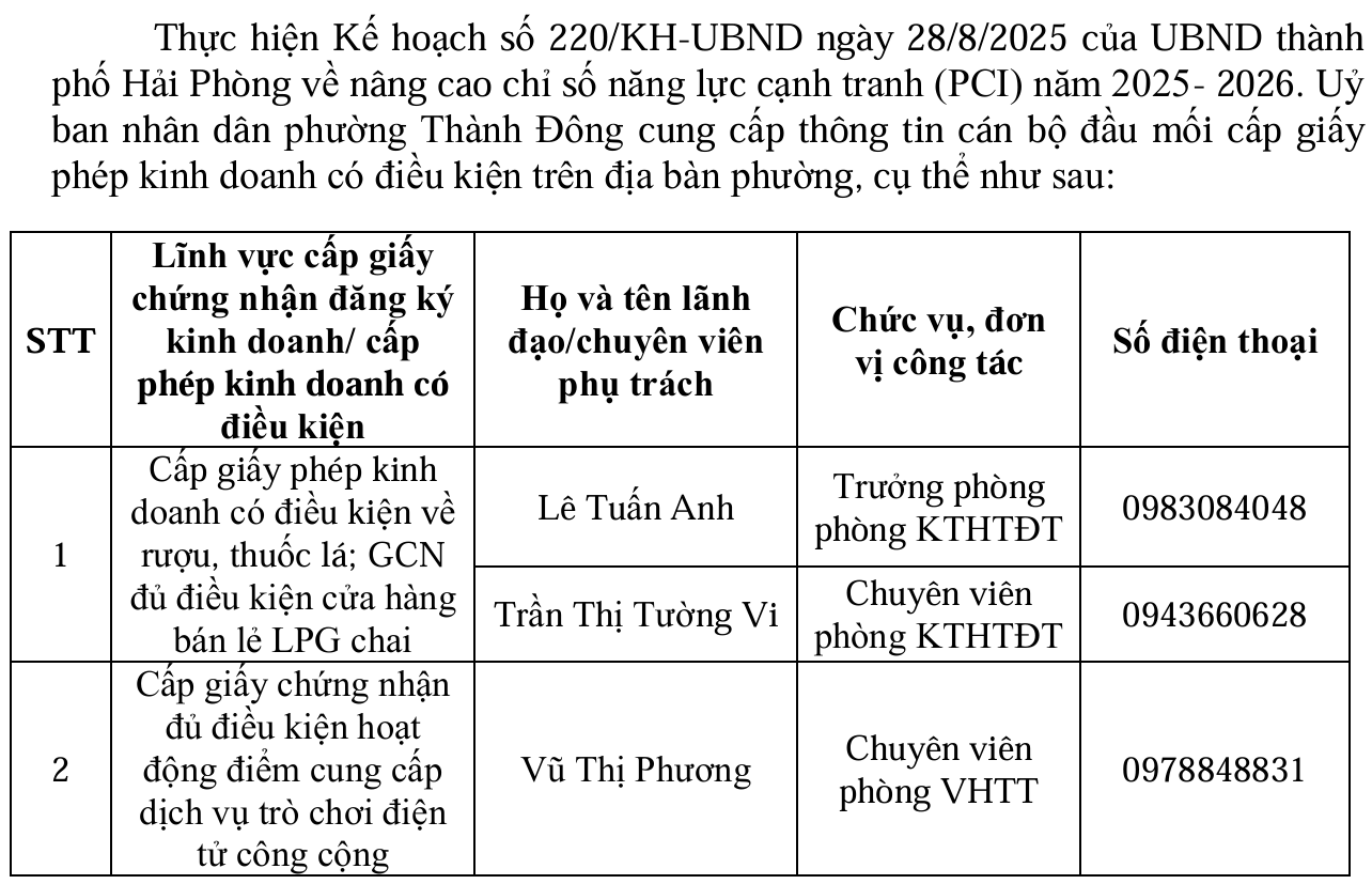 (Haiphong.gov.vn) - Danh sách thông tin lãnh đạo, công chức phụ trách lĩnh vực cấp phép kinh doanh có điều kiện phường Thành Đông: