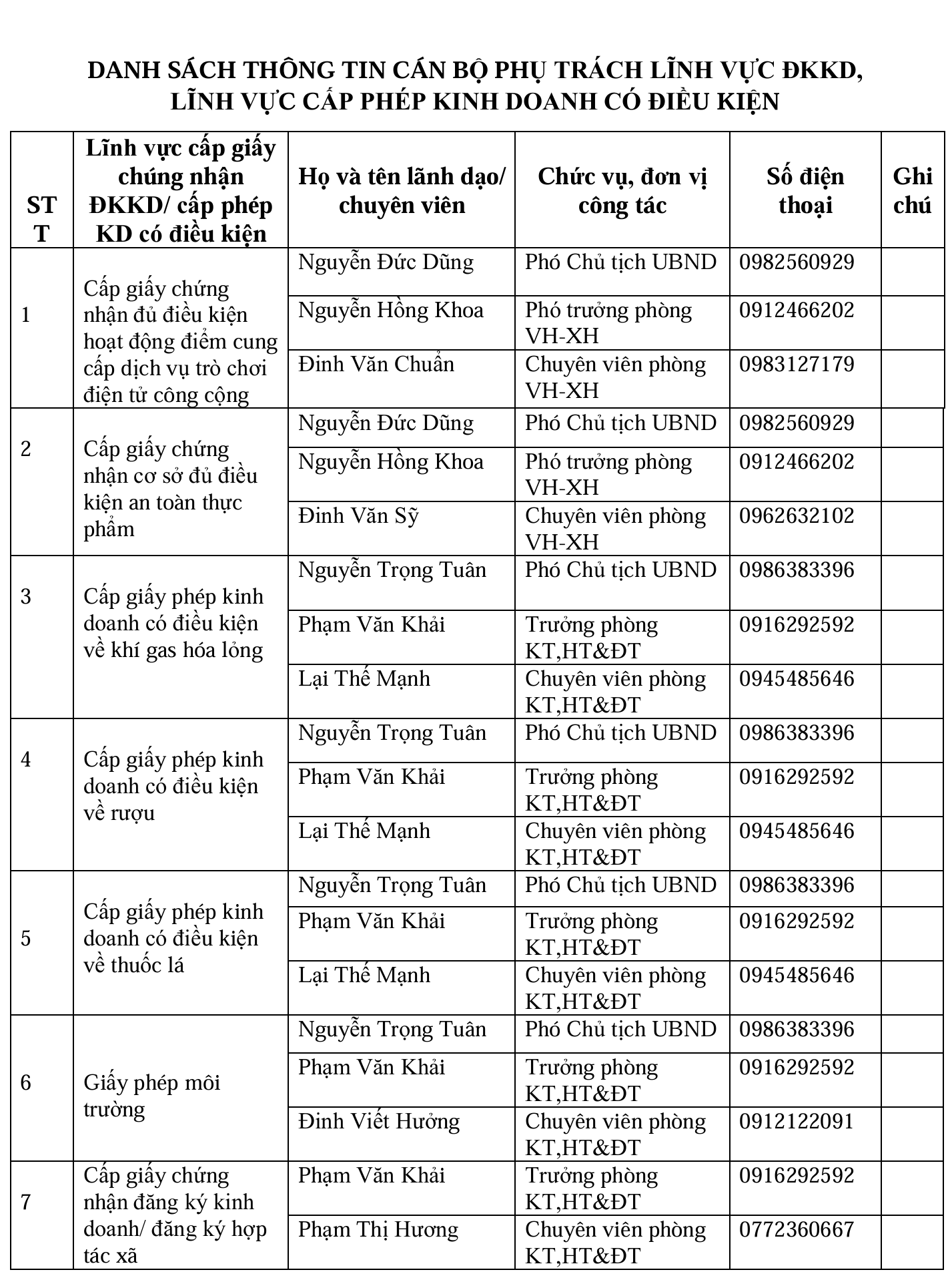 Danh sách thông tin lãnh đạo, công chức phụ trách lĩnh vực cấp phép kinh doanh có điều kiện phường Nam Triệu