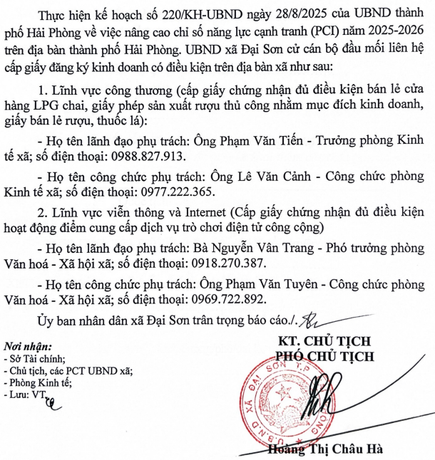 (Haiphong.gov.vn) - Danh sách thông tin lãnh đạo, công chức phụ trách lĩnh vực cấp phép kinh doanh có điều kiện xã Đại Sơn: