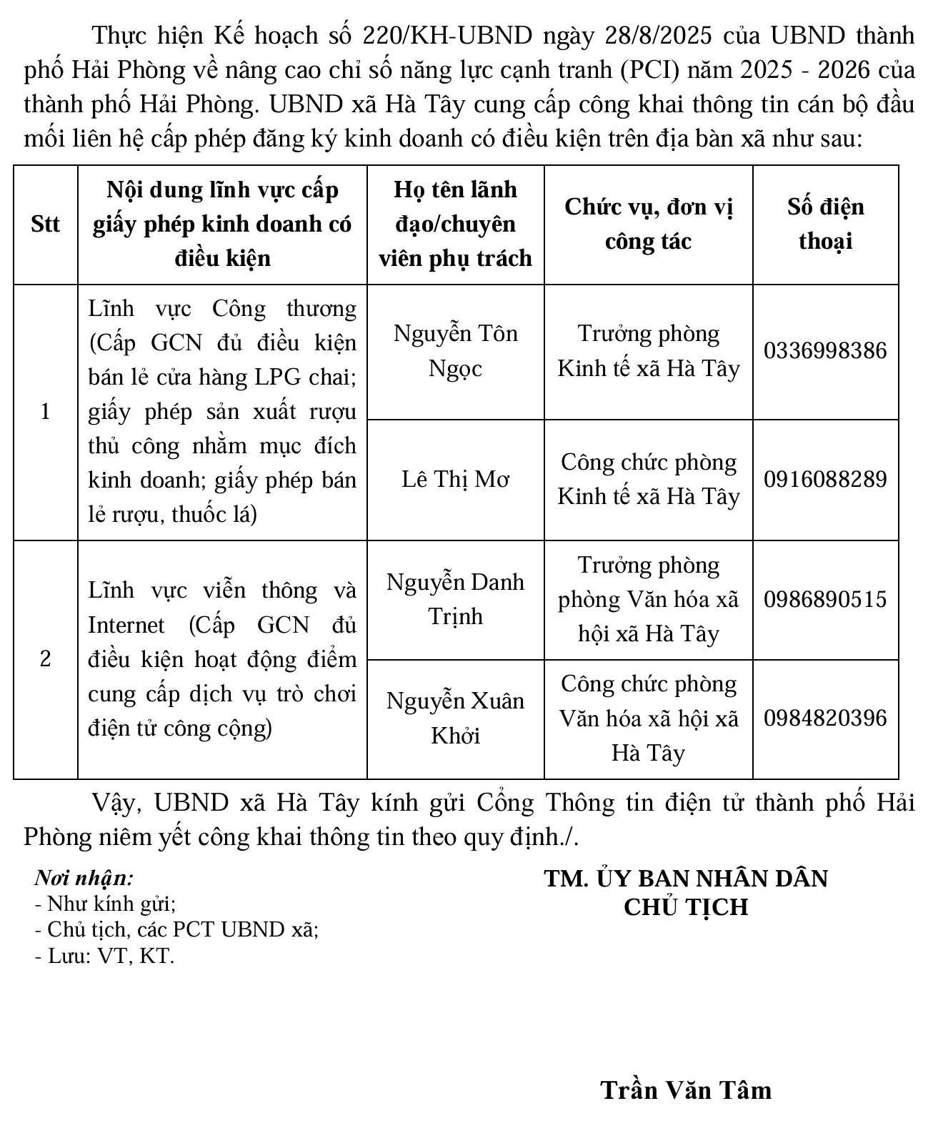 (Haiphong.gov.vn) - Danh sách thông tin lãnh đạo, công chức phụ trách lĩnh vực cấp phép kinh doanh có điều kiện xã Hà Tây: