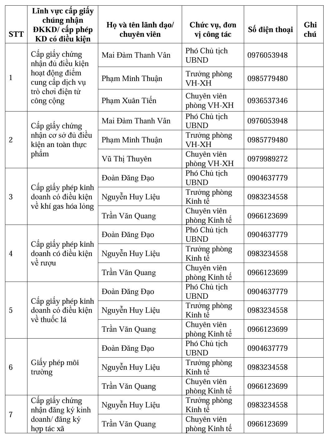 Danh sách thông tin lãnh đạo, công chức phụ trách lĩnh vực cấp phép kinh doanh có điều kiện xã Quyết Thắng