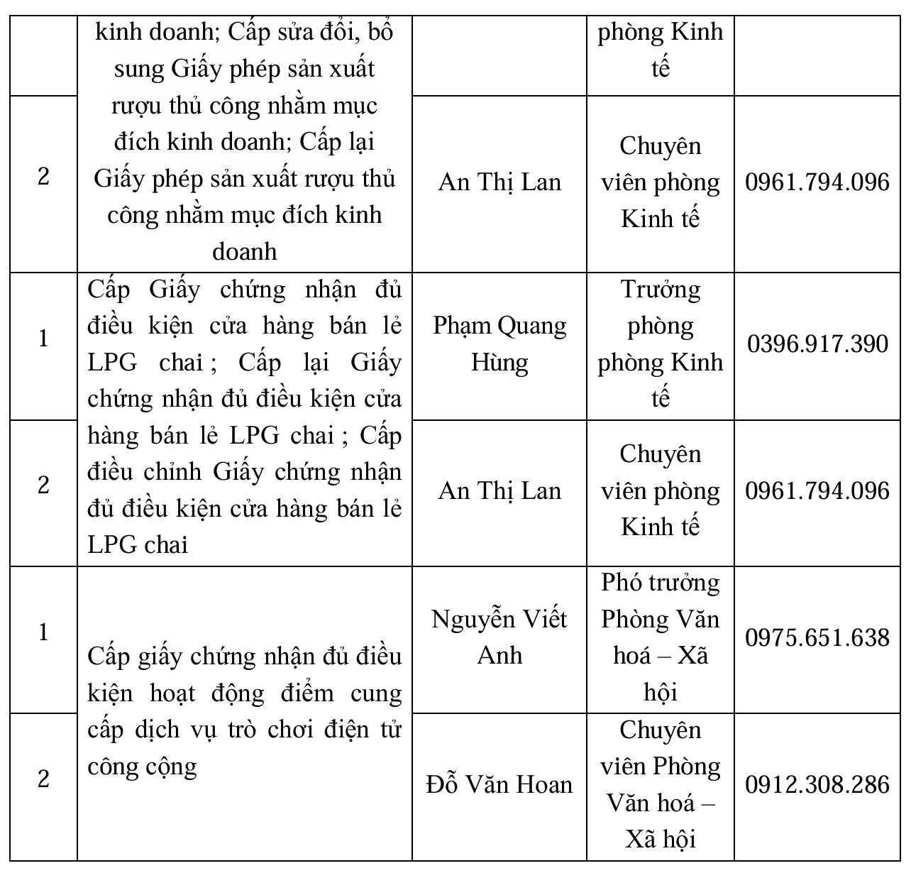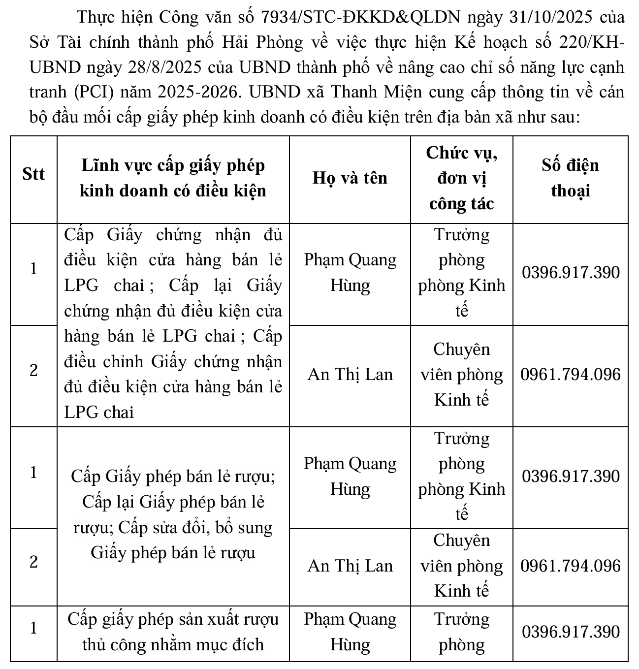 (Haiphong.gov.vn) - Danh sách thông tin lãnh đạo, công chức phụ trách lĩnh vực cấp phép kinh doanh có điều kiện xã Thanh Miện: