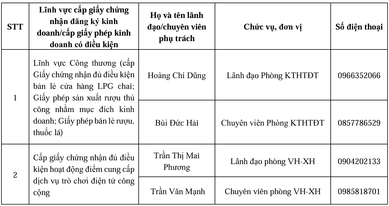 (Haiphong.gov.vn) - Danh sách thông tin về cán bộ đầu mối cấp giấy phép kinh doanh có điều kiện trên địa bàn phường Hòa Bình