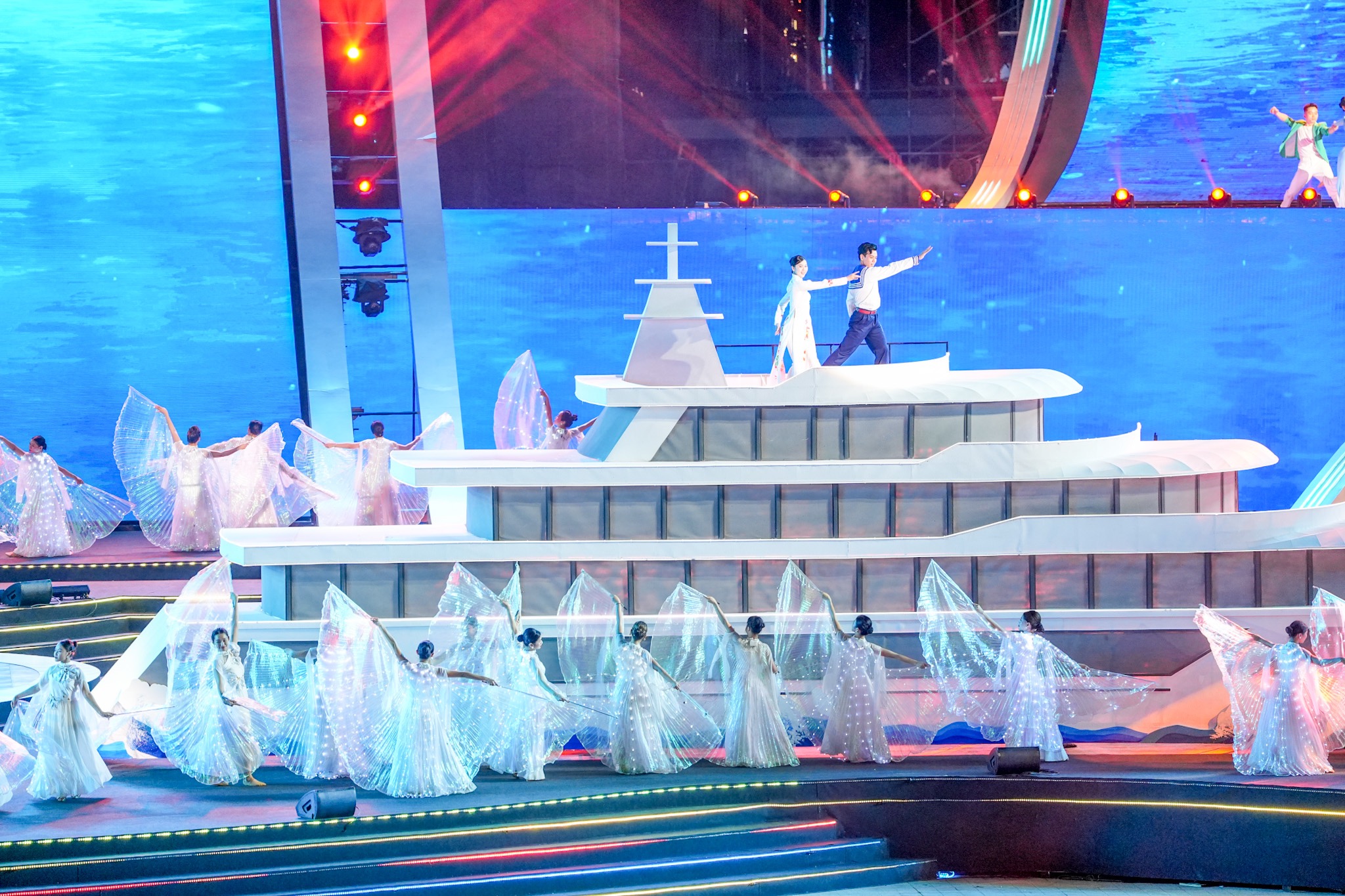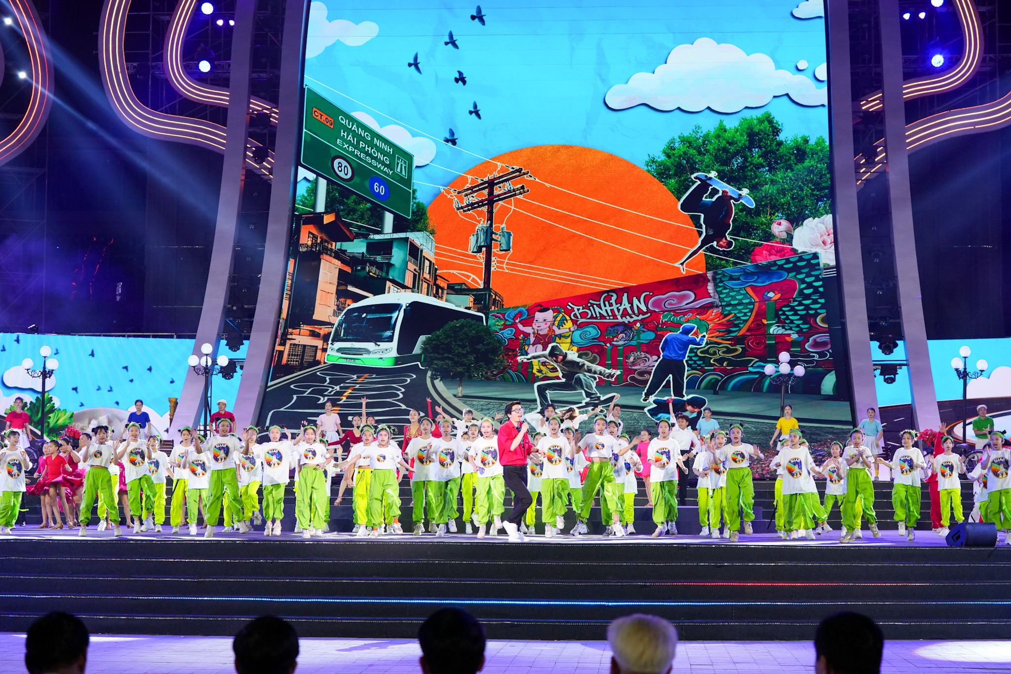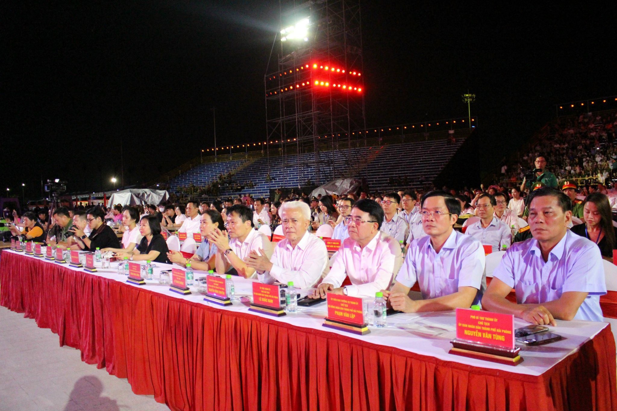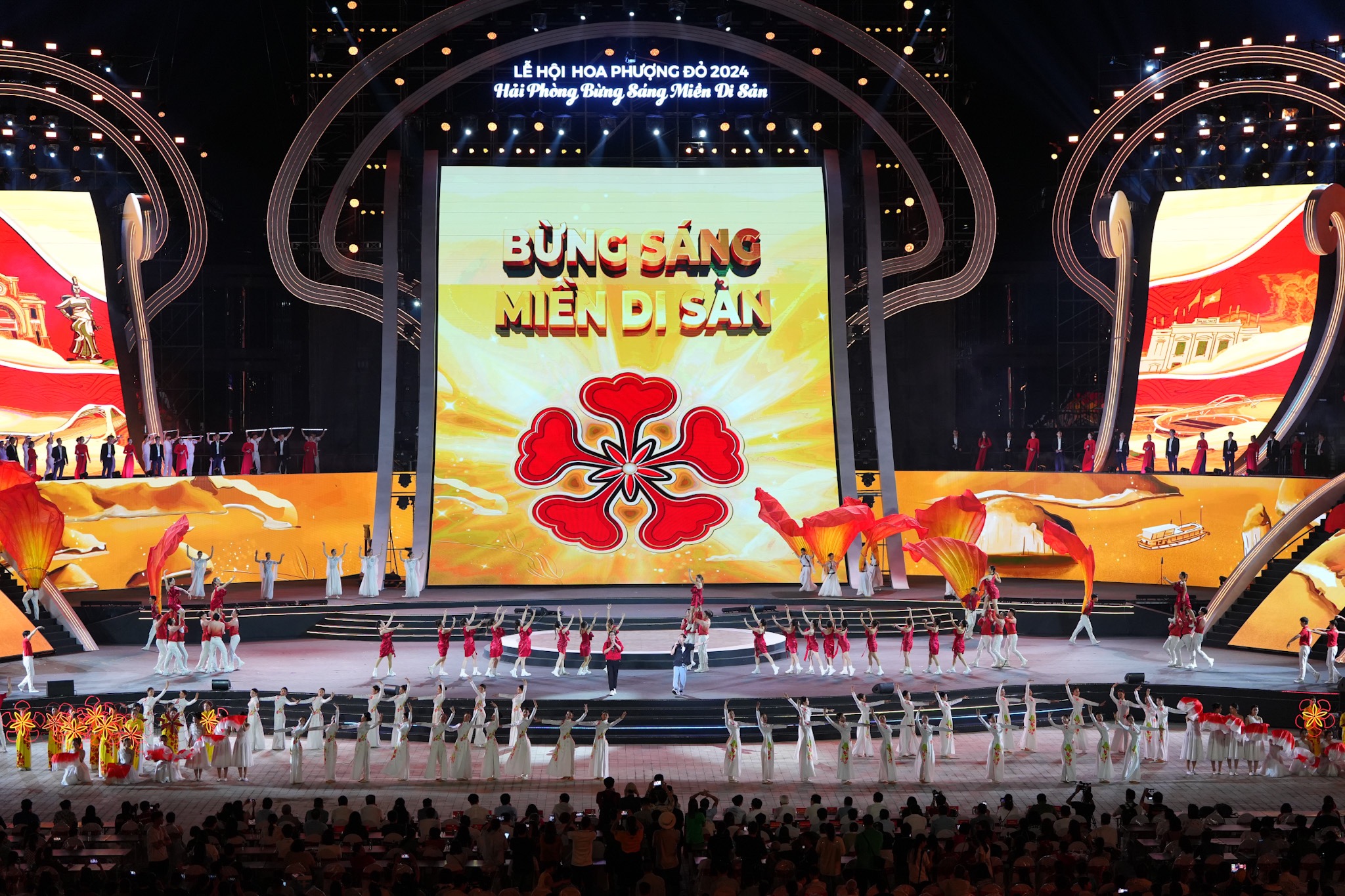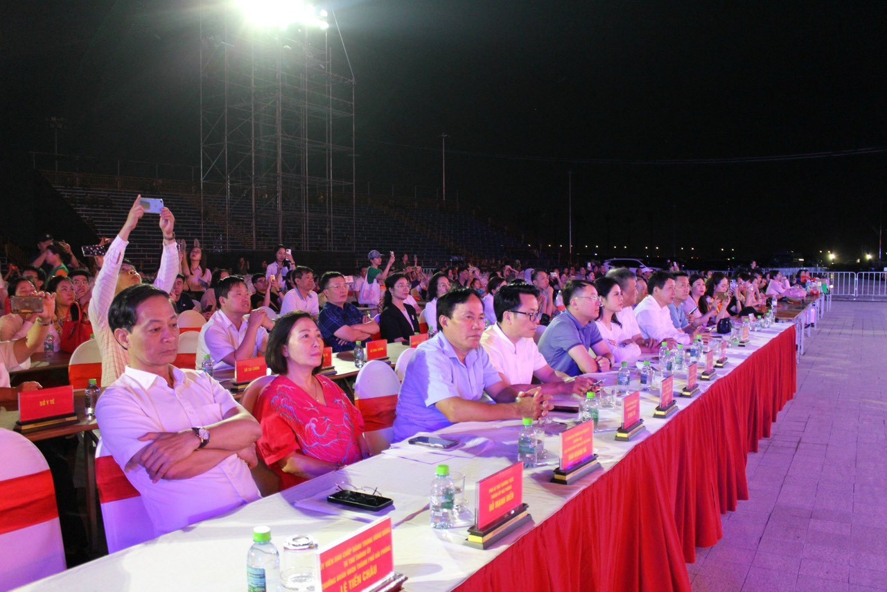 Các đồng chí lãnh đạo dự chương trình.Tổng thể sân khấu lấy cảm hứng từ hình tượng bông hoa phượng bừng nở, tạo cảm quan thưởng ngoạn ở nhiều góc độ khác nhau về thành phố Hải Phòng vươn lên mạnh mẽ, ngập tràn sức sống, nêu bật dấu ấn trọng đại, thành tựu quan trọng trong hành trình xây dựng, phát triển thành phố. Điểm đặc biệt của sân khấu là khán giả ngồi ở bất cứ vị trí nào cũng có thể hình dung được hình tượng xuyên suốt mà chương trình muốn khắc họa. Các cánh phượng được uốn tạo hình vươn lên, khớp với các tòa nhà công trình hiện đại của Trung tâm Chính trị - Hành chính thành phố Hải Phòng. Tất cả tạo ra sự hoà hợp cùng những biến chuyển ấn tượng với nhiều lớp diễn từ cao xuống thấp cho cảm giác xa gần, đồng thời biểu thị việc kết nối trục thời gian: Quá khứ, hiện tại, tương lai của miền đất nơi cửa biển. Đây là chương trình đêm hội có quy mô lớn nhất từ trước đến nay trên địa bàn thành phố Hải Phòng cả về sân khấu, khán giả, khán đài có sức chứa lên đến đến 18.000 người.
